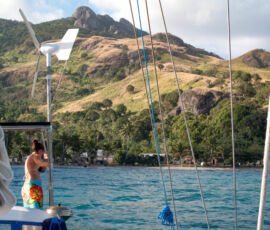 I would insist on at least 1400 Ah of battery capacity, 400 W of solar, and a wind generator, just like we had on Syzygy, together with all of the same electrical savings we implemented, e.g. LED lighting, efficient fans, efficient refrigeration, etc. The ability to live normally without having to run a generator was crucial. I do NOT want to be that boat that’s running a generator in the anchorage.