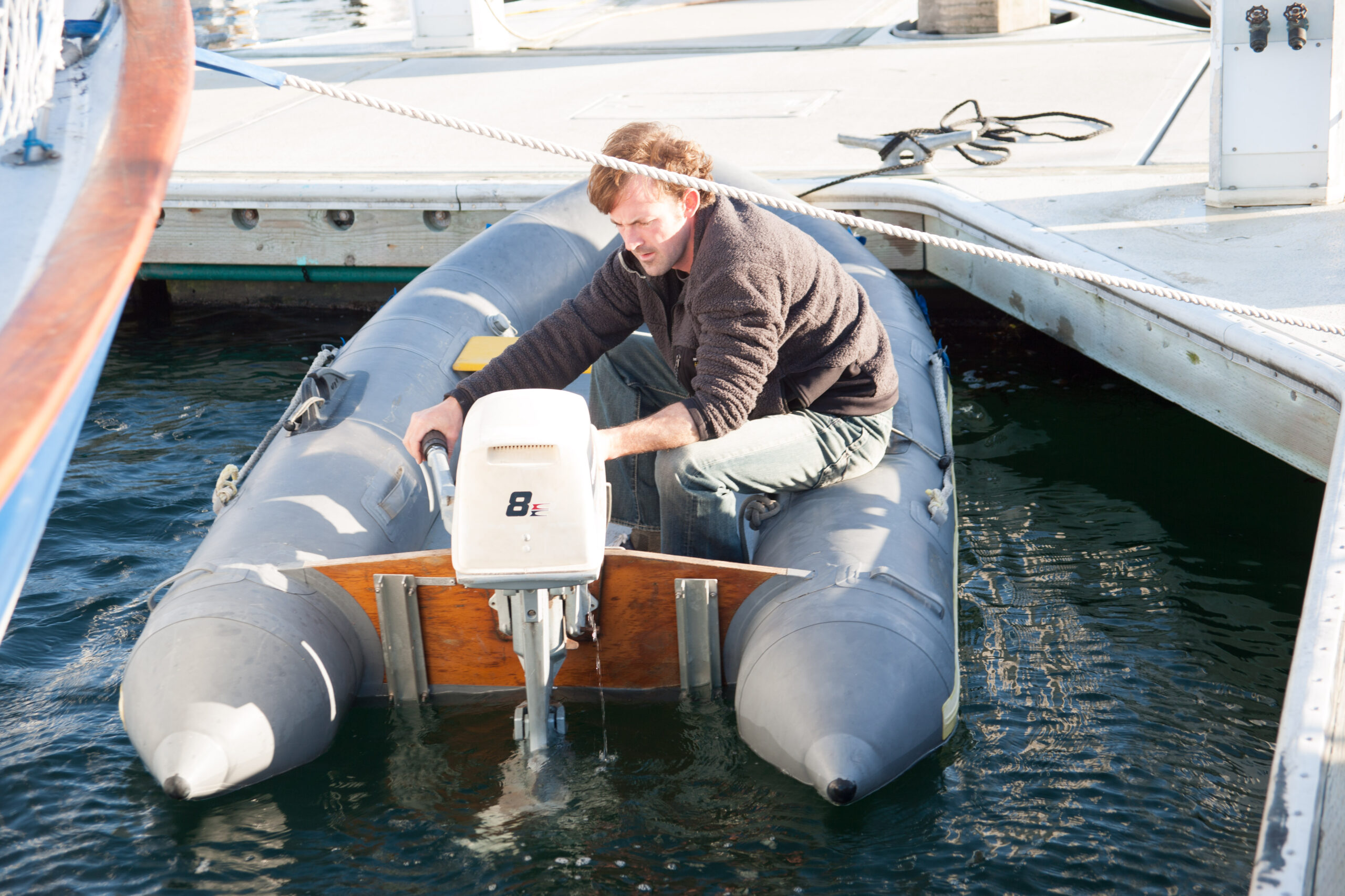 As we pulled away from the dock, I grabbed the line and stood up.  Another boat passes by.  I note the wake (the waves eminating from behind the boat) they create, and think: not a problem.  Their wake reaches us and rocks us side to side.  I then think: this is a problem.  I stumble from side to side, and as there is not much room side to side on our dinghy, I proceed to be clipped in the calf by the sides of the dinghy and tumble backwards overboard.