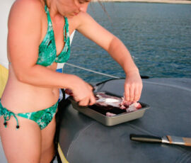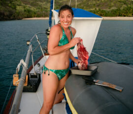 This morning, in the previous bay, we made a number of trips to the beautiful spring (mentioned in the prior post) to fill up our water jugs and deliver them to our tanks. As we were dinghy-ing back to our boat the final time, some locals were returning to the beach in their own dinghy. They waved us over, and as we pulled up they whipped out a big bloody goat leg and handed it over to us–apparently they had spent the morning hunting goat in the hills (successfully). We expressed our sincerest appreciation, and I was appropriately amused by the sight of karen wielding our bloody leg as we bounced and splashed our way back to the mothership (see bloody goat leg below).