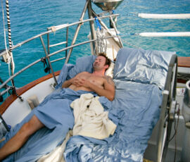 Anyway, after looking like a bunch of anchoring idiots for an hour–we managed to drop it onto some rock and it kept dragging on us–we settled in to a beautiful spot. The water is turquoise colored and crazy clear, and the beach is pretty white sand fronted by palms. There are only three other boats nearby, so we may just wander around naked anyway. Perhaps I will make a general announcement on channel 16: “if anyone in this anchorage would be offended by the sight of naked hotties, please respond with your boat name now.” Nude or clothed, I suspect that this may be our favorite spot so far.