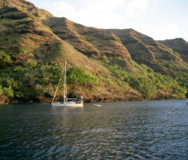 The Bay of Virgins is lauded as one of the most beautiful anchorages in all the south pacific–I thought it was quite nice. It is set apart from other spots in the Marquesas by having the most impressive relief: both the anchorage and the small town are surrounded by vertical and overhanging rock formations. The entire western side of the island has vertical cliffs rising out of the ocean, and crescent shaped knife-blade ridge of mountains through the center of the island is as steep as any I’ve seen.
