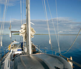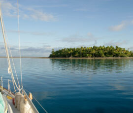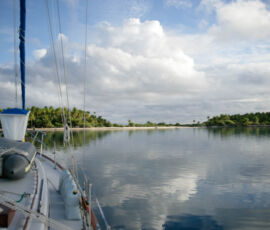 Regarding atolls: an atoll is a ring of coral with a lagoon in the center. Sometimes the ring is an unbroken strip of land around the lagoon, but more often it is a mixture of little islands and barely submerged coral reefs. There are usually only one or two passes into the lagoon (and sometimes none at all). As the tides rise and fall, all the water in the lagoon tries to enter and exit through these passes, creating at times ridiculously powerful currents. I have read reports of 20 knot ebb currents in some passes. As the current in the pass encounters the ocean swell outside, crazy stuff can happen (think white water rafting on the ocean). Adding to the danger, the passes are often very narrow; the entrance to Makemo was only 85 yards wide–that sure doesn’t feel like much as you’re being carried along in a fast-moving river of current. And further compounding the peril, coral heads and reefs lie just below the surface, sprinkled throughout the passes and the lagoons like booby traps specially designed for sinking boats.