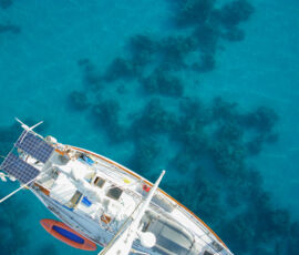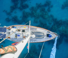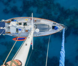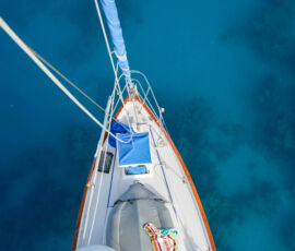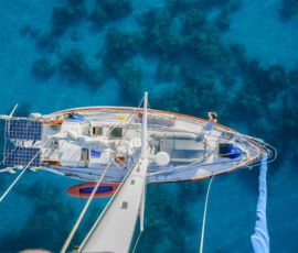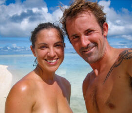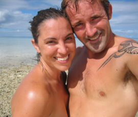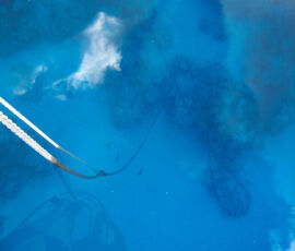 It was also our first experience with anchoring among large coral heads. Some anchorages in the atolls have mostly sand and little mounds of coral; other spots, like the very first one we encountered on Makemo, have large 8ft tall stacks of coral to wrap the chain around. In the pictures you can clearly our chain nicely snaked around (the depth is 50 feet in these shots). It’s good and bad–good because with your chain all tangled up there’s no way you’re going to drag anchor when the wind picks up–bad because it can be a real bitch when you go to retrieve your anchor. It was fortunate that we had such great visibility; as we weighed anchor karen snorkeled off the bow, examining how the chain was tangled and directing me how to steer to unwrap us. Combine mediocre visibility with a coral head minefield and it would be easy to lose your anchor somewhere in these atolls. Neither of us know how to dive–this would be a really good skill to have in places like this, if only to save a $500 anchor!
