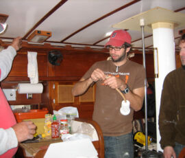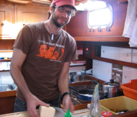 The shit-laden seacock was another matter. Its inside looked like a giant clogged artery, and it took an arm and a leg to close it all the way. We scrubbed and scrubbed with bronze wool and a couple of bronze brushes, but to little avail. Then we improvised. We poured hot water into a cut-open milk jug (Jon brought a propane camping stove), dropped the seacock in, and scrubbed the inside with pieces of coat-hangers. Voila: if you’re looking for a gallon of piping hot shit broth with a full-bodied shitty aroma, there’s no better way to go. And, lucky for us, if you’re looking to take 10 years off the life of a seacock, our method’s not so bad either.