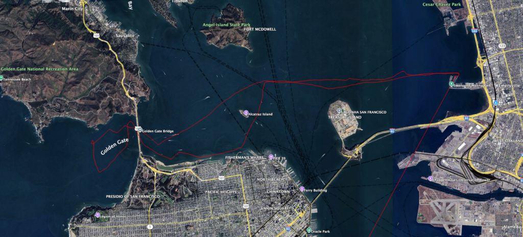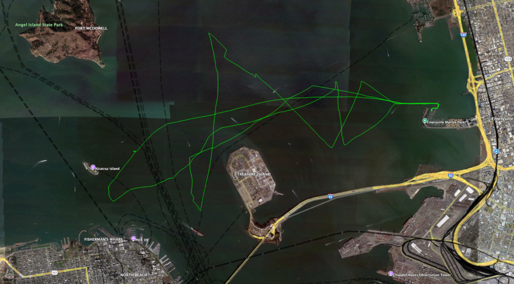 Jon flew out from denver last week to spend the holiday on his boat, and his parents flew in to join us (and get a look at the boat). We went out the day after thanksgiving, got a late start (1pm or so), and made incredible time out to and past the gate. On turning around to head for home, we discovered the cause for our great speed: a 4.5 knot ebb, reaching its peak just as we were trying to get back under the bridge. We spent a fair amount of time crossing back and forth trying to make headway against the river of current trying to push us out to sea. We discovered that the best place to be for a favorable current was right up against the shoreline, as close as we were willing to get–the catch-22 is that the wind fell off close to the shore, as we got in under the lee of the marin headlands. We spread some more canvas (the staysail) and that gave us a little bit of a boost. Once we reached the water along chrissy field (north shore of san francisco) we were home free–we were even helped along at that point by a couple knots of flood. We motored into the marina well after dark, ending another fantastic day on the bay. Here’s our funny looking track, although honestly I expected it to look a lot more ridiculously convoluted than it does:
