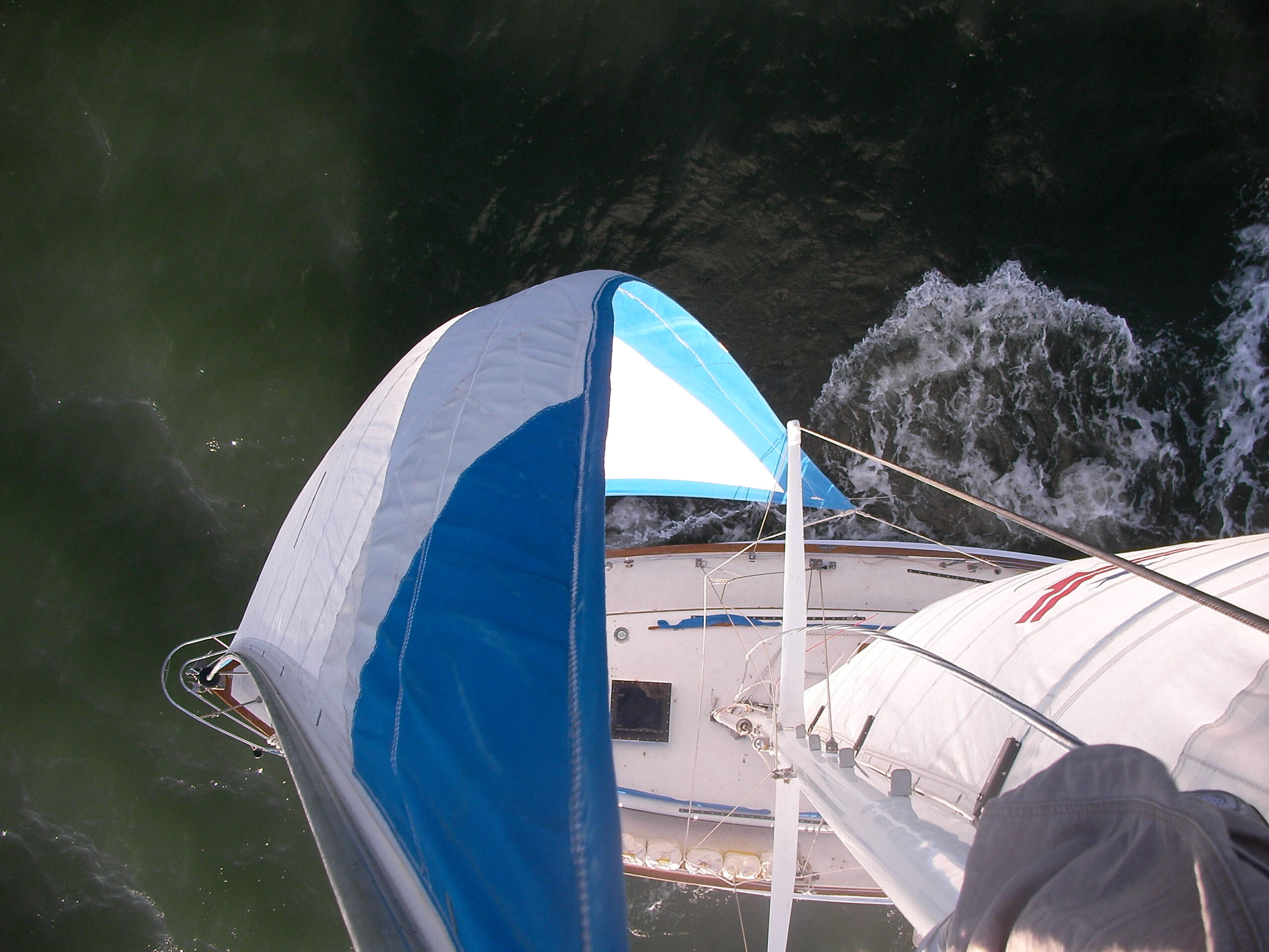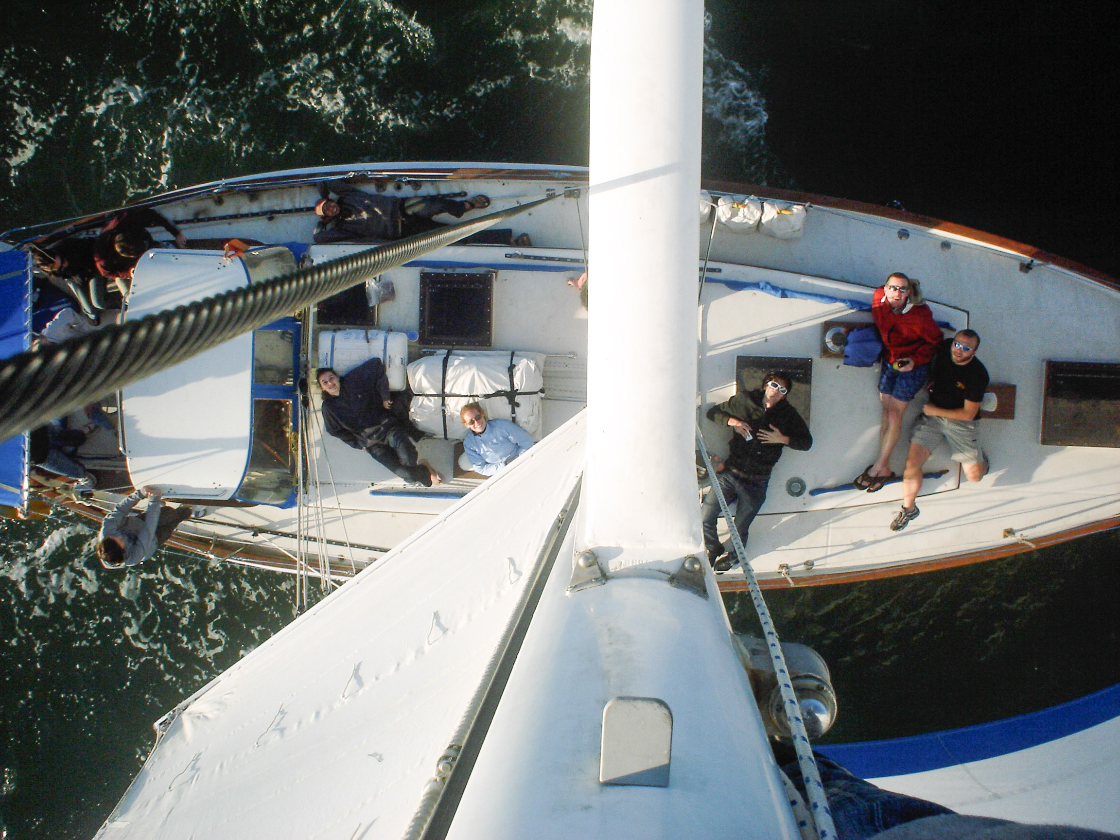 They work so well that we’ve been running up the mast regularly while we are out in the bay under full sail. It makes for good group pictures during our social sails, to do them from the top of the mast looking down with the sails flying and our wake spreading out behind us.