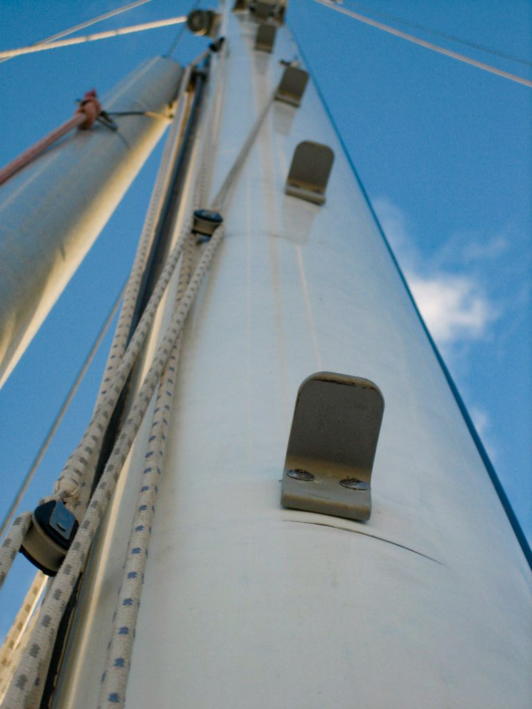 They are sweet steps, as far as mast steps go. They’re small, so lines don’t catch on them, they’re easy to install, and they’re cheap. The only reason we made our own is because we weren’t happy with any of the other options available–the others are either to big (the fixed stirrup-style), too unwieldy (the folding ones), or too expensive (all of them).