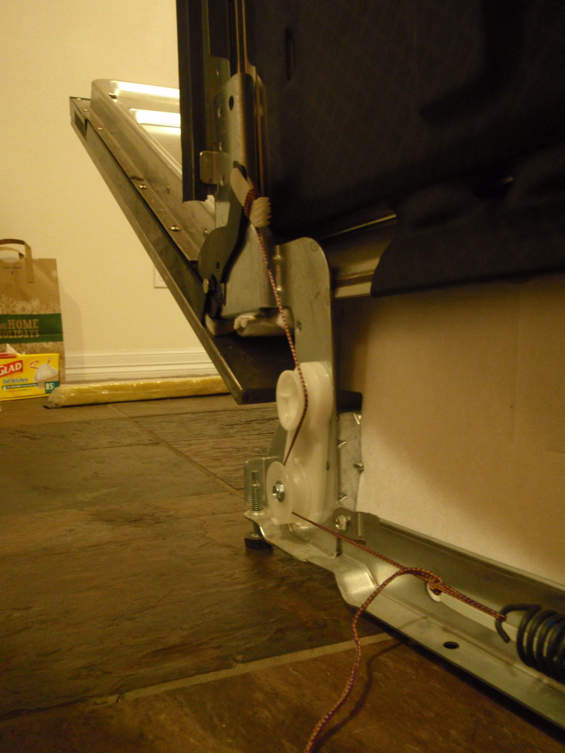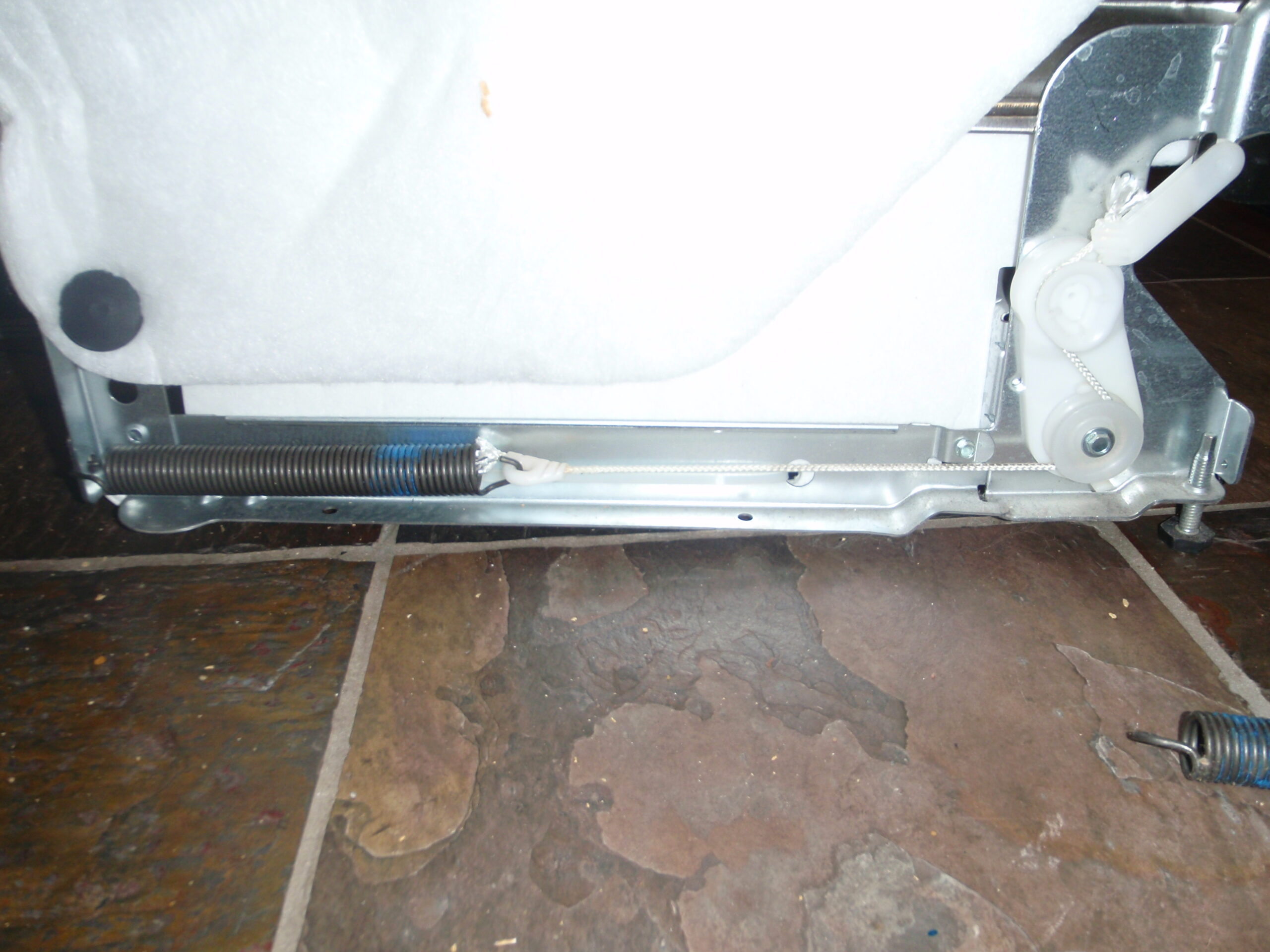 My dishwasher was broken. Not broken in the sense that it didn’t work, like our solar panels which do not currently work, but the door would no longer stay open at any angle of heel. The door would also would come crashing down if only partly open and then left to its own devices. The door used to stay open at any angle of heel The door used to not come crashing down. Thus, the dishwasher was broken. I was loath to do anything about it, however, since a) it didn’t affect actual functionality, and b) the last time I fucked around with major kitchen appliances, I broke a coolant tube in my refrigerator, necessitating a new refrigerator purchase, a minor $700 setback. This I did not want to repeat. However, the small annoyances of a broken dishwasher door got the better of me, and I began to poke around and see what was wrong. I originally imagined hydraulic arms were somehow at work and had stopped functioning; similar to the hydraulic arms that held up the hood of my now long deceased 1987 Buick Delta ’88; the car I rolled in throughout high school and was pimpin’ with in college. But it was an ancient car of dubiously questionable quality, not a young sprout like my dishwasher and not at all like the seasoned rock-solid champion of a sailboat we have in our Valiant. Lying down on the kitchen floor to look at my dishwasher, I immediately noticed a problem, not the problem, but a problem. My floor, surprise to all, was filthy. Not so coincidentally, like the floor of the boat when I was there all last summer. After a cleaning, I was back down to look and see this on the left side of the bottom. The white bracket is the key piece, as I noticed it hanging aimlessly on the right side, the starboard side, but here, on the left side, the port side, it is connected to a string, one could say line if it were on a sailboat, which runs over two pulleys, let’s be real: turning blocks, back to a large spring. This string and spring were not visible on the starboard side. Perhaps I conjectured, the string had channeled our old reef hook and broken, causing the spring and remaining string to go flying into the empty recesses in the corner of my cabinetry disappearing perhaps never to be seen again, a-la screwdriver that Matt dropped behind the water tanks. With this success of the discovery of the bracket-string-turning block-pulley disparity, I felt compelled to continue and attempt to fix the problem. Two screws held a black plate across the bottom. Quickly removed, it was obvious they did nothing, similar to many many sailing parts, but did hide a myriad of electrical and plumbing work, and there was an electrical wiring diagram attached to the back of this plate. Matt may have stopped here for a couple of hours distracted with electrical niceties, but I only saw the warning where it recommended unplugging the dishwasher before moving it. I didn’t even know how to do this, but saw things from under the dishwasher running into the cabinetry to the port, under the sink. Look at that! A plug and a drain. Amazing. Moving forward, further examination revealed two screws that did hold in the dishwasher. After quickly removing them, I began to tug on the dishwasher and soon it was out. I felt committed. It might as well have been a water tank sitting in the salon staring at you expectantly. After pulling the dishwasher aside, I looked back into the wasted space underneath the corner of the counter… and there it was! The spring! Lying there like a furtive chipmunk, hoping no one would see it!. . . Back to figuring out how to use that spring, this is what the port side looked like: . The spring was under some tension, but not considerably and so I disassembled the port side to get a better look at that plastic arm above the turning blocks. On the side that worked, the string went through the arm and then was frayed above the arm. It was impossible to pull through, which was a good thing, since quite a bit of force was exerted by the spring when the door was down. Force like wind. Gale force wind. However, it seemed inconceivable that the mere frayed end was keeping it from getting pulled through. There was no knot above the arm, nothing that would indicate to me some stopping type device. Perhaps it was an alien rope clutch which mere humans cannot open. I was baffled. Consequently, there was no way I was reassembling the broken side and getting the string back through the hole in the arm. The hole looked to be 1/2 as big as the string. The best I could come up with is the plastic arm was actually molded around the string, but that really doesn’t make any sense. I still don’t understand. I also don’t understand our sailboat electrical system, or the diagram Matt drew for it, communication devices, refrigeration, water maker, solar panels, the tow generator, celestial navigation, and women. But I make do. Luckily the arm had another attachment point that I could tie a NEW string to. Whip out some line, and tie a knot around the arm. Yep, that’s a double constrictor knot, something I picked up while tying stuff together on the boat. Sweetness. Now, to attach the other end of the line to the spring. Yes, your eyes do not deceive you! That, my friends, is a bowline! Yet another handy knot picked up during this whole sailing business. I reassembled the port side, measured the initial spring tension, and then marked that on the starboard side, the side I was aiming to fix. I put together the broken side with my knots and line. With everything assembled, it was time for the first test….. Failed! When the knots tightened down under the force of the spring, there was too much slack in the line, and therefore not enough force from the spring on the door. Or maybe I measured wrong, which has been known to happen. Luckily, I had tied a bowline, which we all know is easy to untie even after extreme loading. I shortened up the line, estimating this time a proper compensation for knot tightening. Se