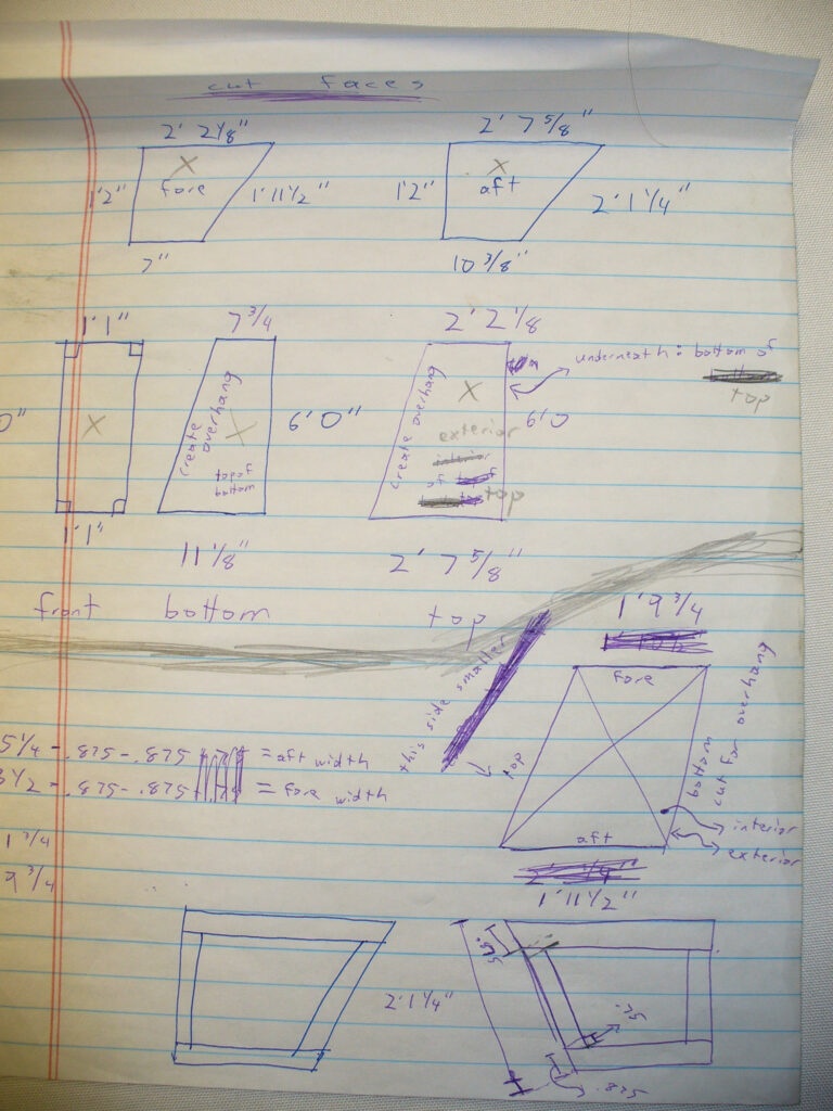Jonny mentioned that before we hacked up that port watertank, Matt and I measured it, because our plan all along has been to build new similarly-shaped tanks out of epoxy-coated plywood. But he failed to mention some complications. (It’s a sailboat; of course there were complications, right?) The complications: the tank was shaped funny. It wasn’t a nice boxy shape, like a coffin, but rather one side was more like a torqued trapezoid. The first problem was that trapezoids are kinda looked down on in the shapes world as a named-yet-odd shape. More importantly, the torqued trapezoid was like a piece of paper with the top edge twisted one way and the bottom edge the other, ie. not a flat plane.