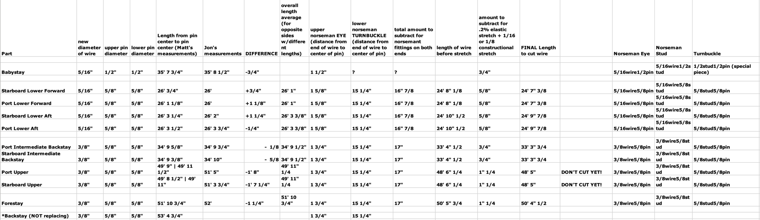Matt and I spent a day last week cutting the new rigging for Syzygy, after we spent a day going over the numbers that we collected in Mexico. Why a whole day looking at 10 numbers? Because there were, uh, discrepancies between Jon’s measurements and Matt’s measurements. Sometimes those discrepancies were only 1/8 inch; sometimes those discrepancies were 1 1/4 inch. Fortunately, that’s why we have turnbuckles — so that we can tune the rig to the proper tautness, even if the shrouds are a bit long or short.