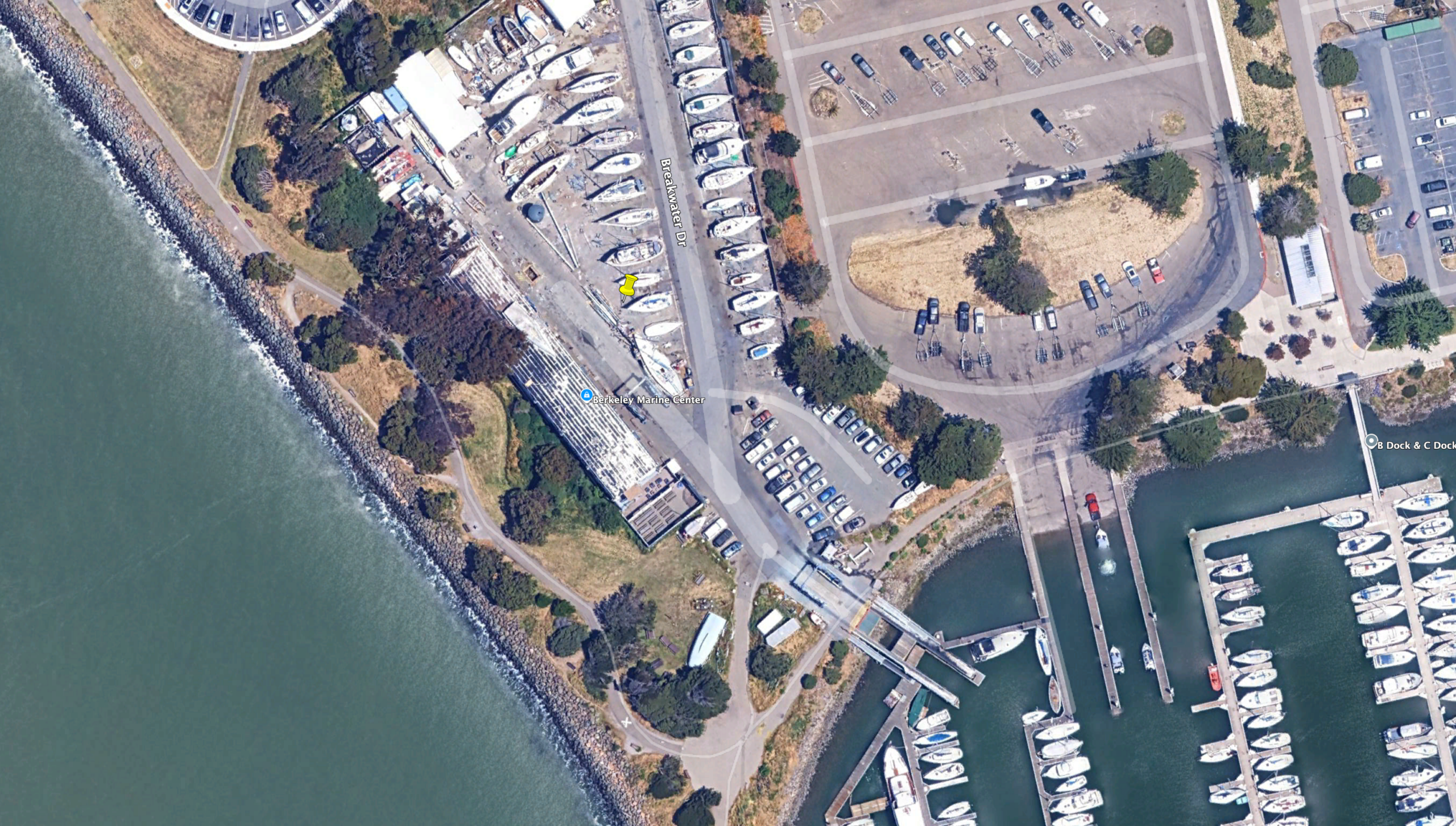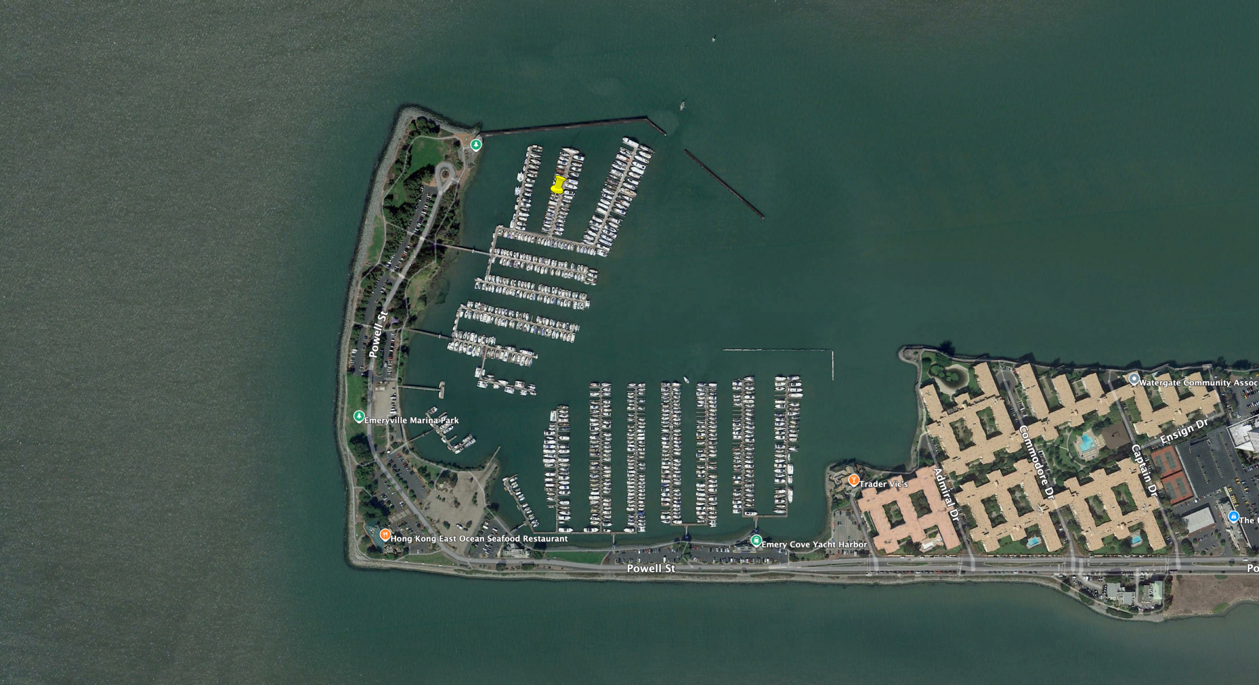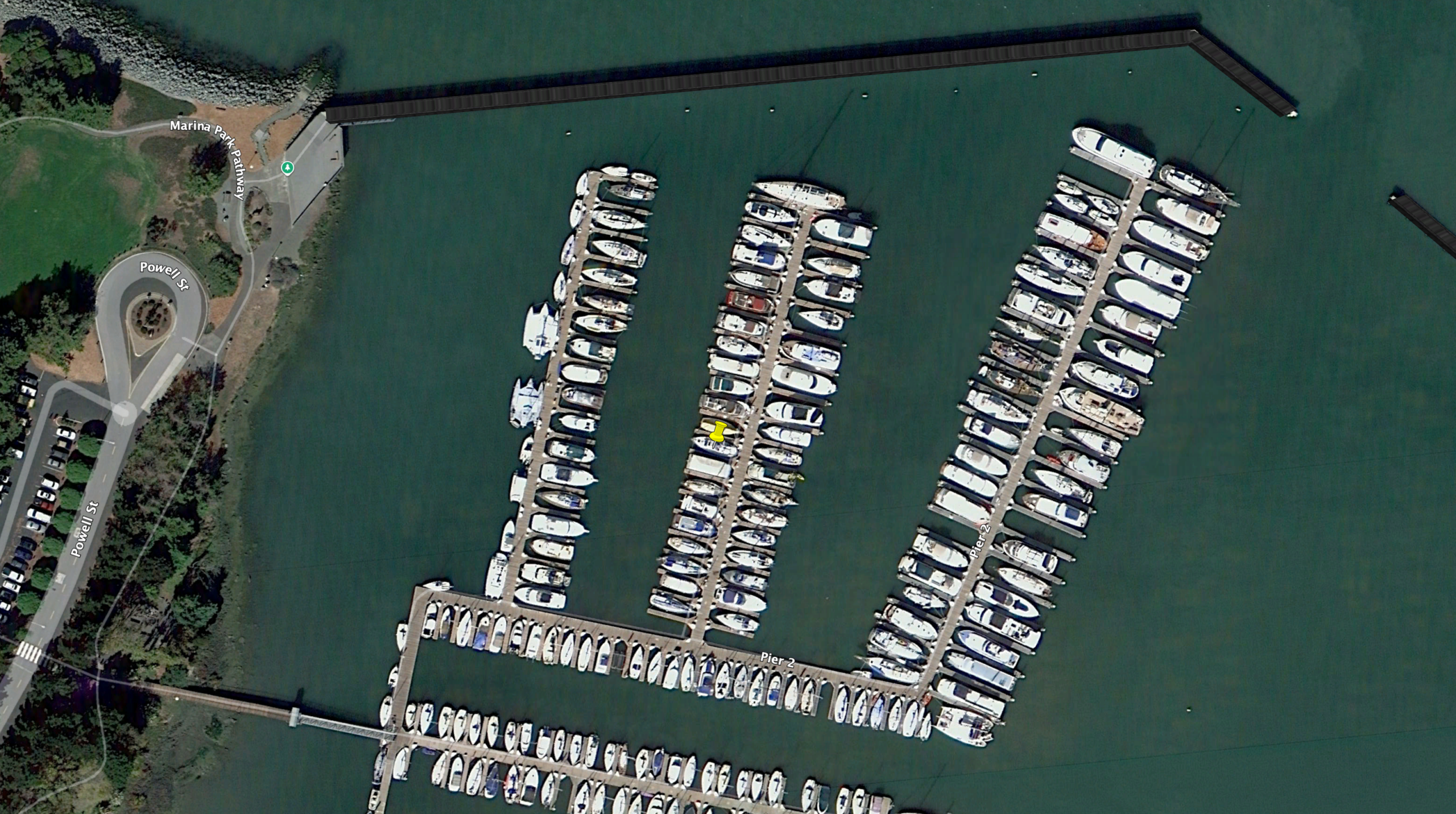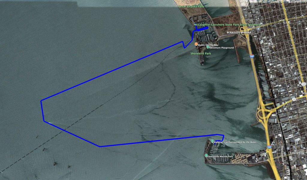 I did not succeed in parking the boat in our slip. As we pulled into the Emeryville Marina a low was moving in, and it was gusting to maybe 15 knots in the marina, which are somewhat challenging docking conditions especially since our slip was downwind but honestly not particularly abnormal. However, I am completely inexperienced motoring our boat around. With her long keel and skeg rudder, she turns like an elephant and backs even worse. As we approached our slip my anxiety skyrocketed–rightfully so, because I was realizing far too late that I had almost no chance of getting us into the slip without damaging a boat. Our boat weighs 22,500 lbs–you can’t hold that off with brute strength–and the wind, not me, was in control.