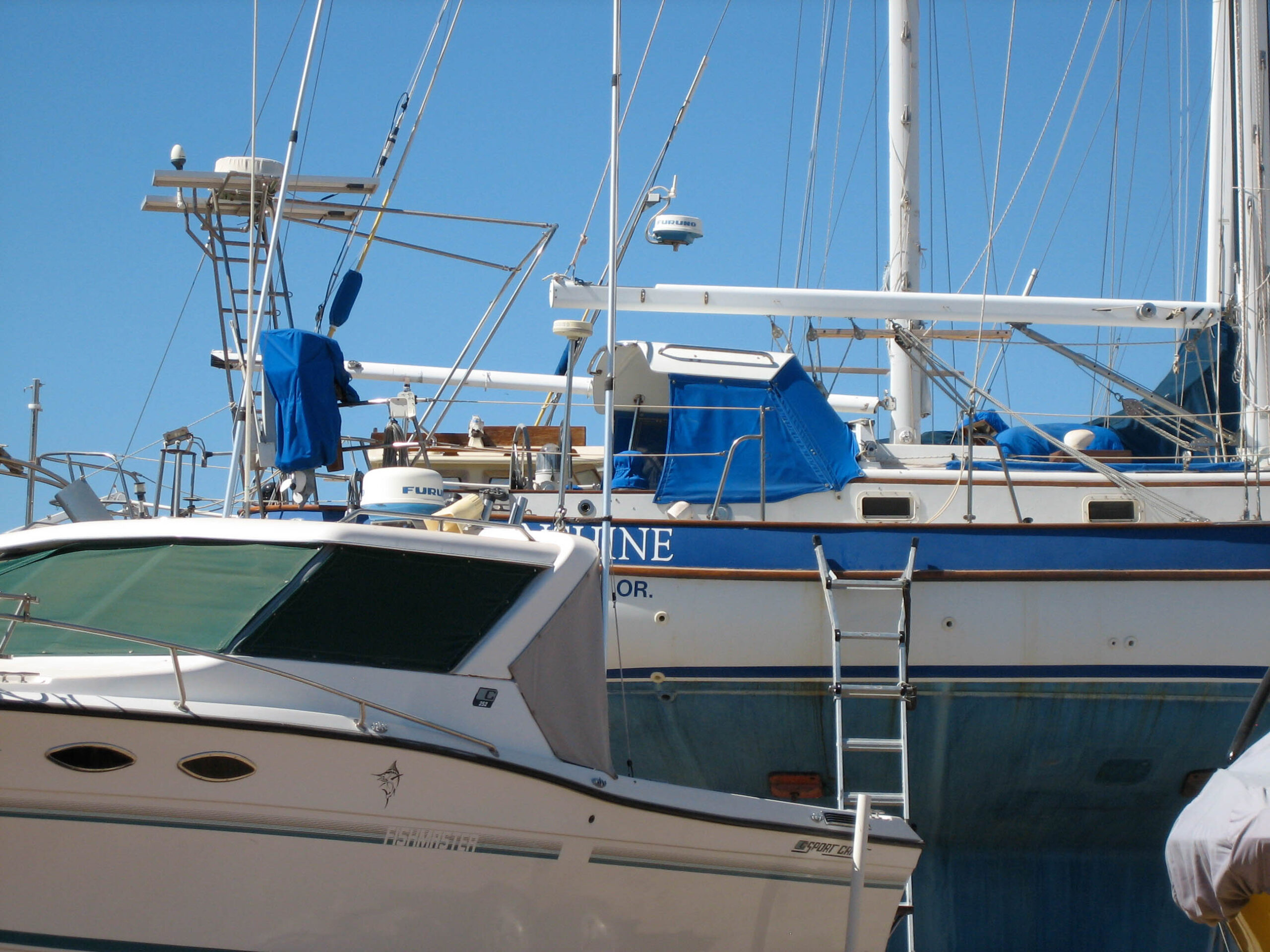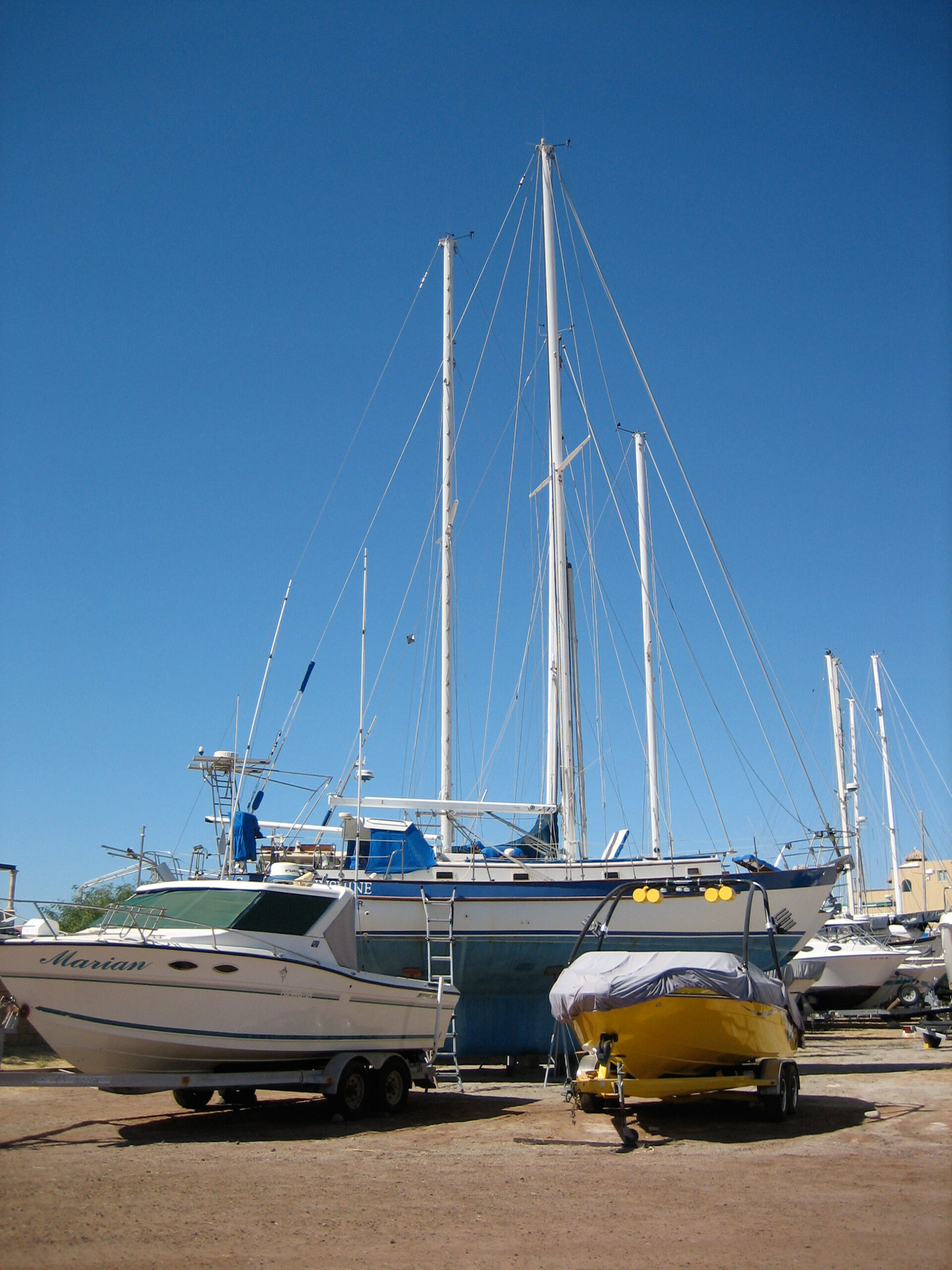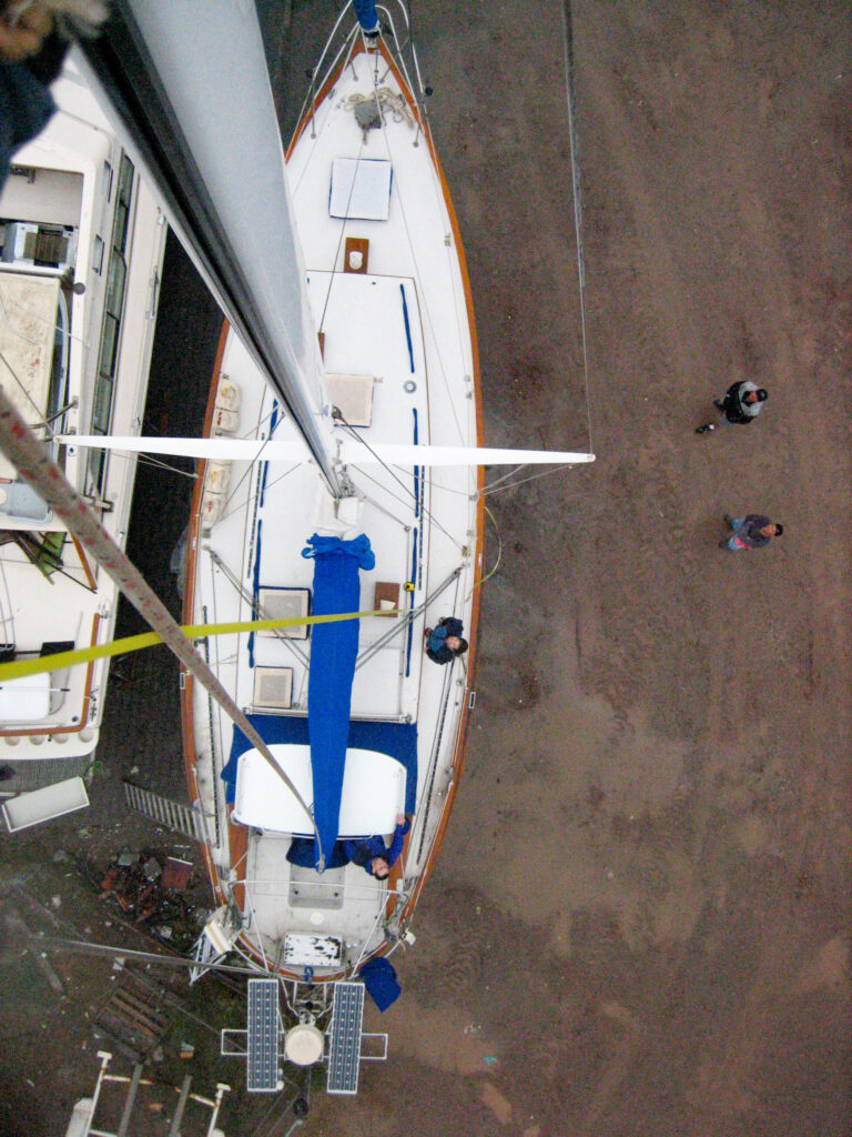 I took this photo while measuring the rigging for replacement purposes. The yellow thing is my tape measure. It rarely rains in San Carlos, but it was raining hard this day–hardest just when I decided to go up the mast.