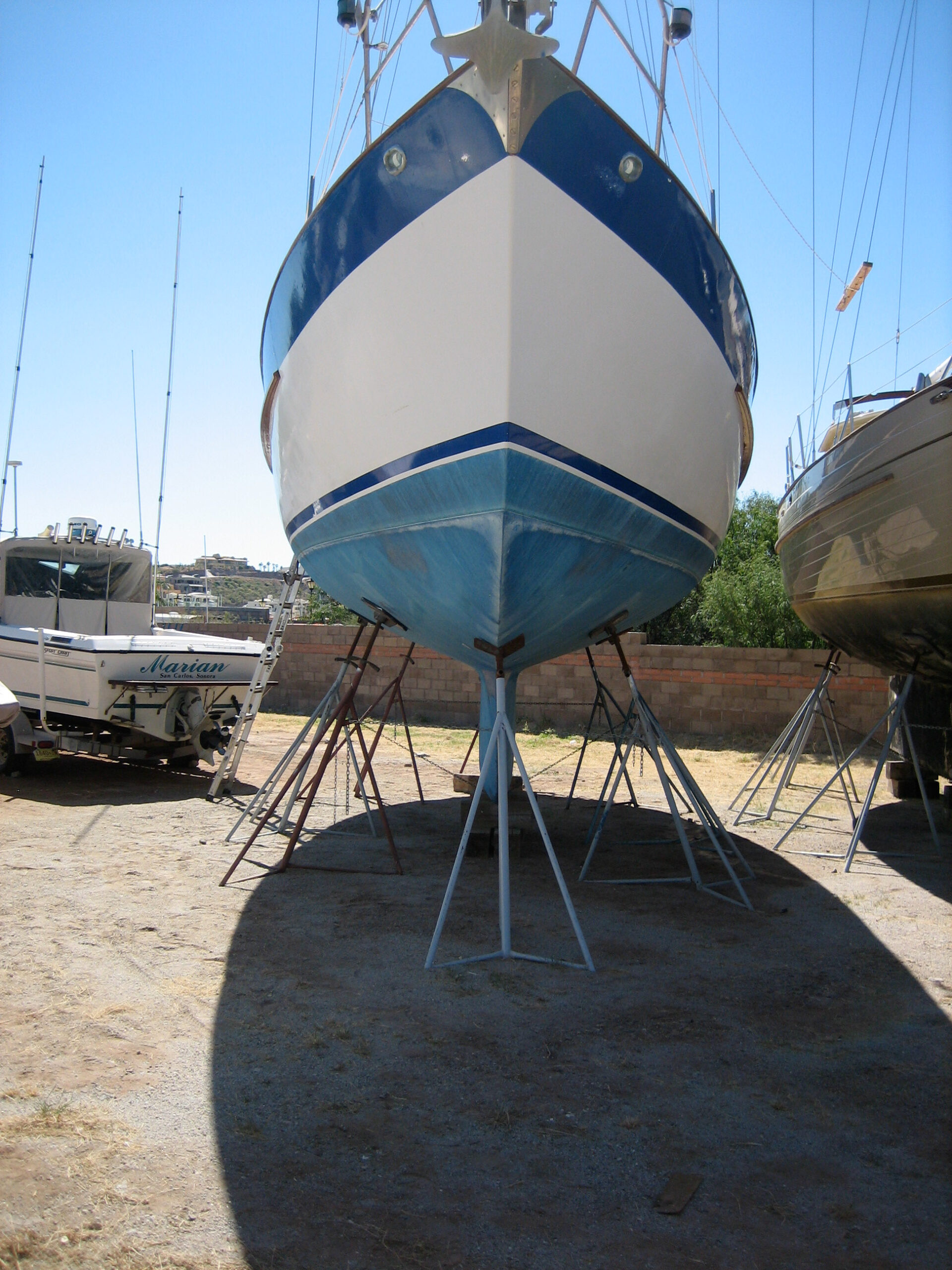 Our first day in the work yard, we met a fellow gringo-boat-owner named Richard. He’d just recently bought his 10th boat, a trawler, and was busy painting it. She’s not nearly as elegant as Syzygy, but she’s definitely cleaner and shinier.