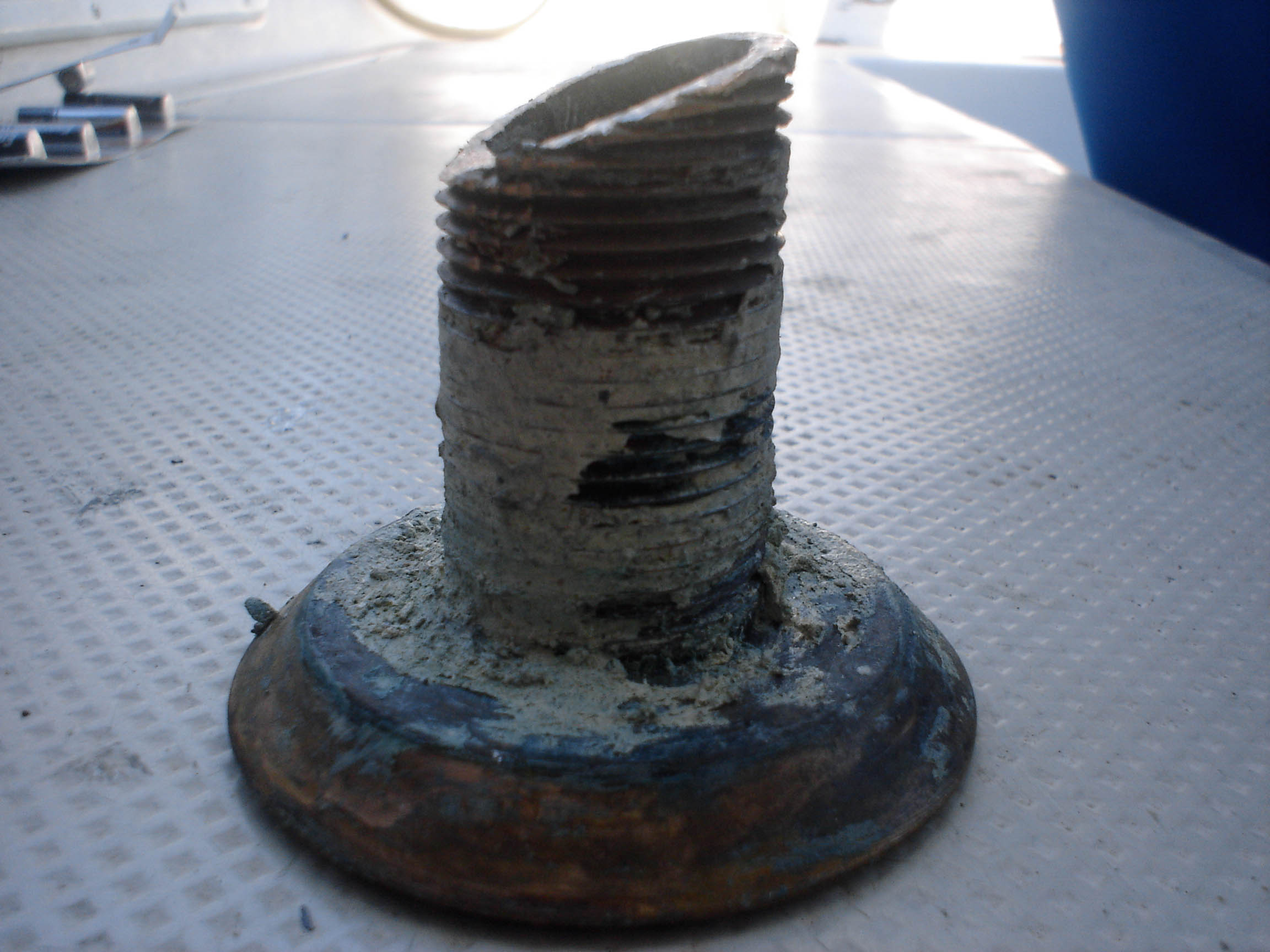 The result: yet more work for us. We’d need to 1) remove the now-damanged through-hull, 2) buy a new one and 3) re-bed it in the hull. Also, there’s the bonus result of a bruised ego for having just essentially cut a hole in your $60,000 sailboat.