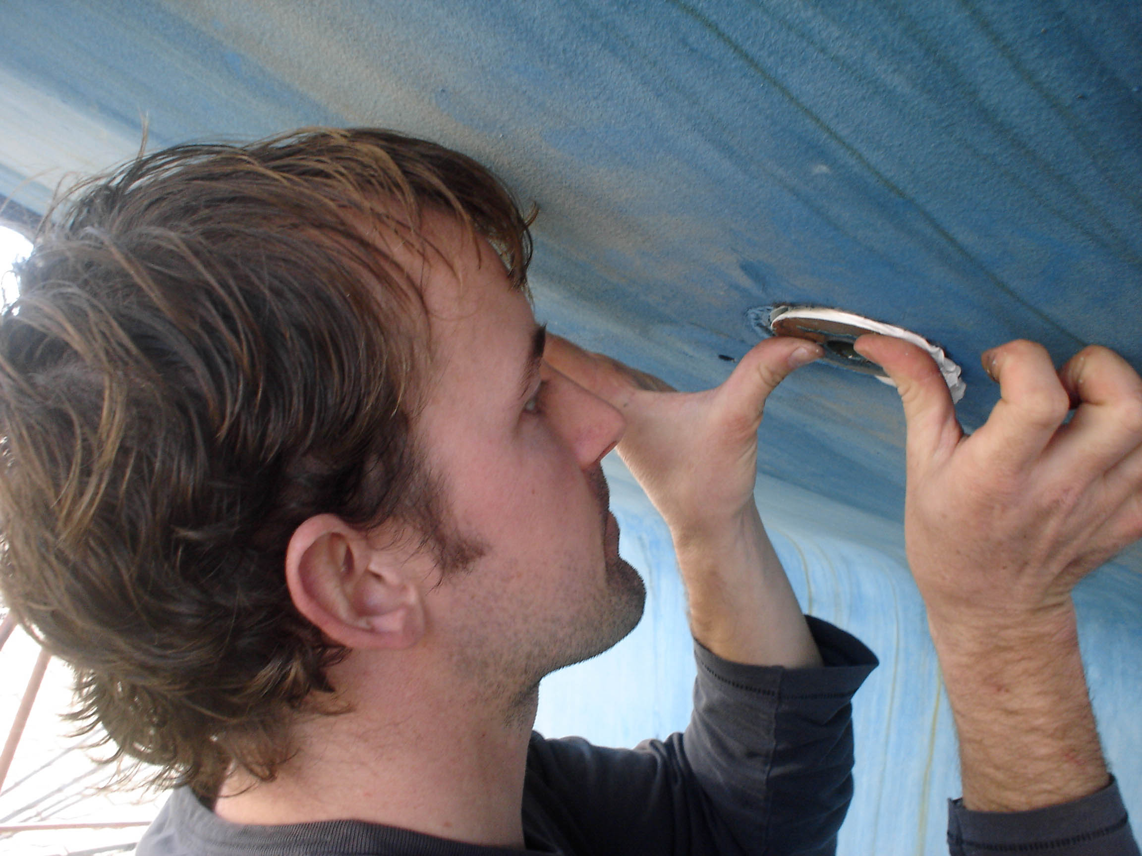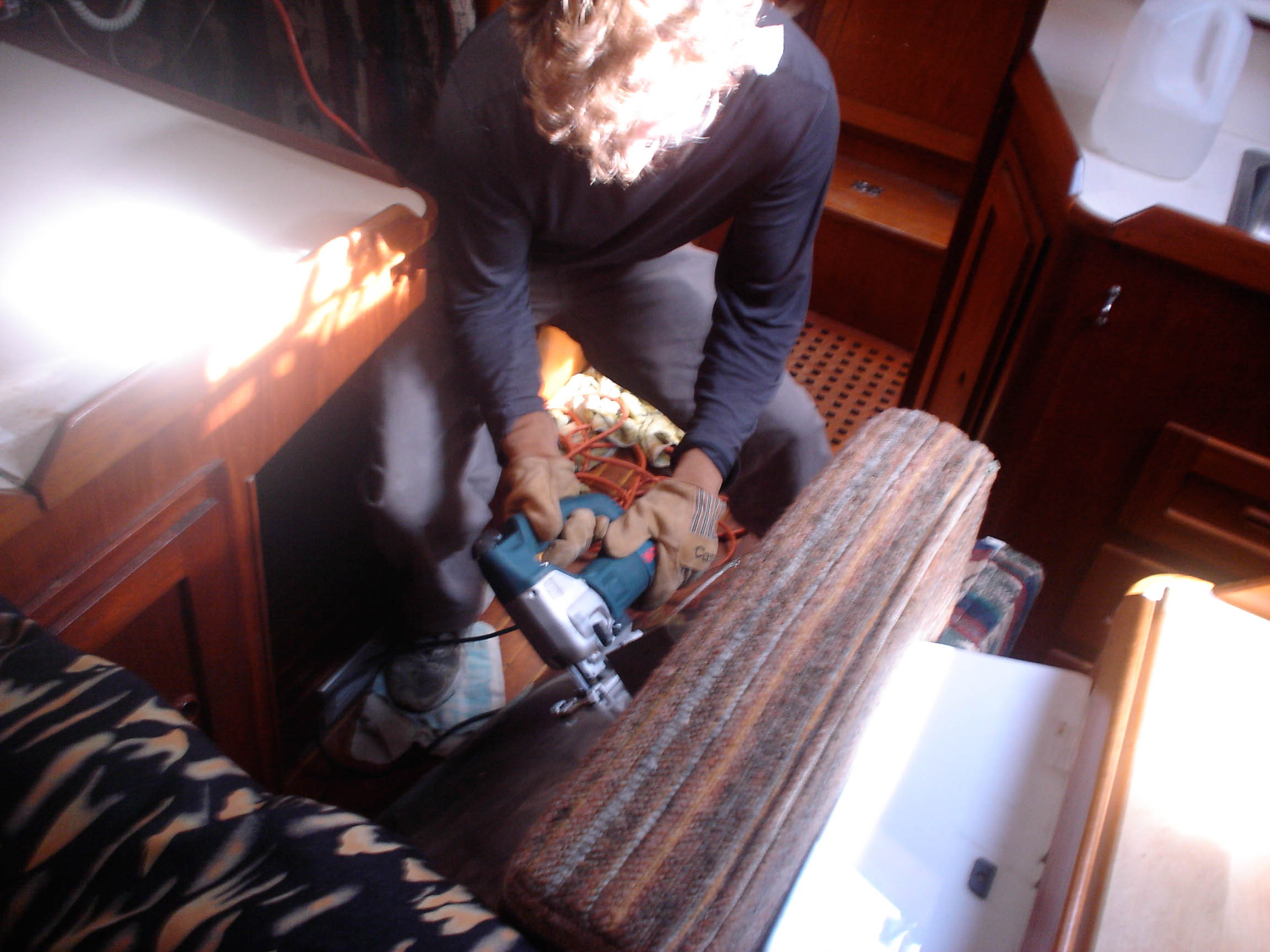 Then Jon got his hands on the jig saw, and decided to have a go at repairing one of the through-hulls. Through-hulls are bronze cylinders that the seacocks screw onto, and you could say that their bomproofness is essential to any sailor’s peace of mind. Seacocks are supposed to be screwed down until flush with the hull, and this through-hull was too long, preventing the flush junction from occurring. Technically, it had been installed incorrectly. It was good, but not perfect. So Jon was just gonna shave off an inch or so.