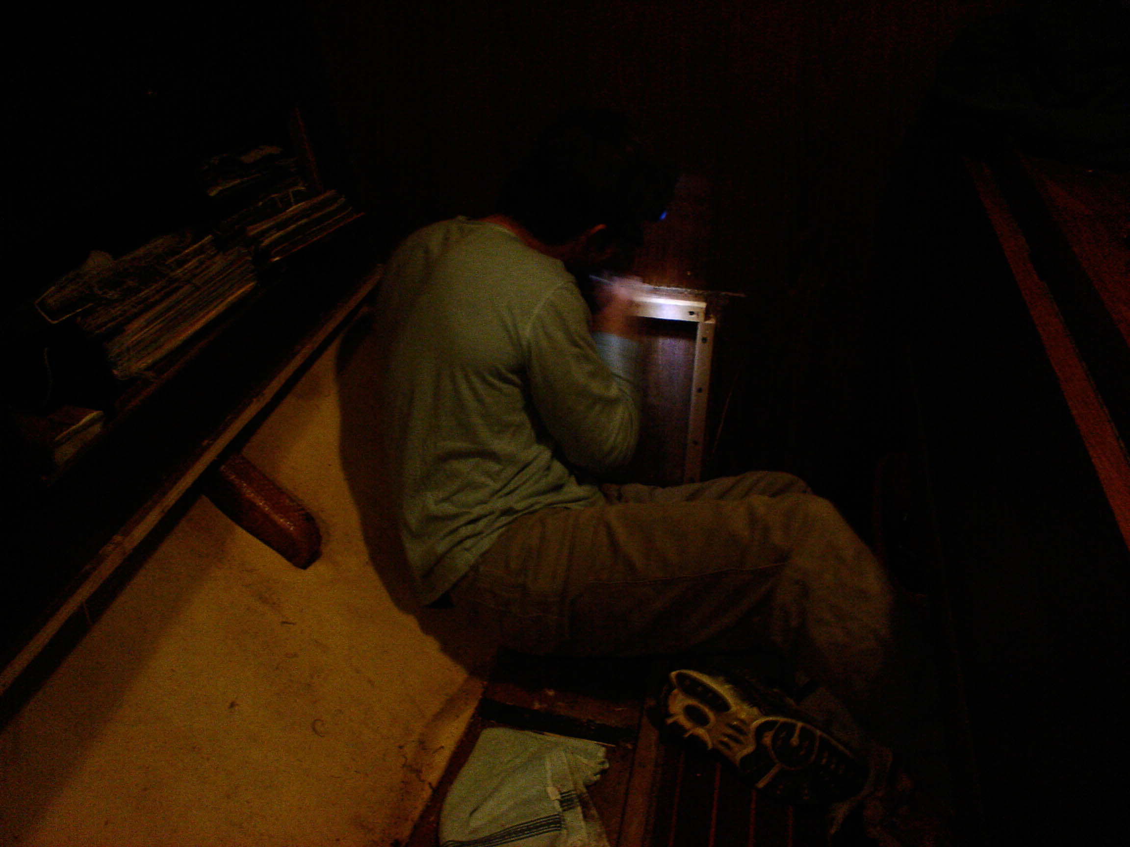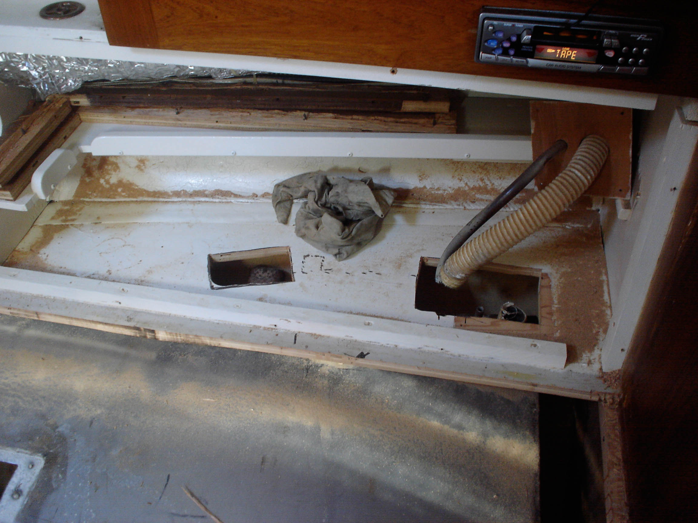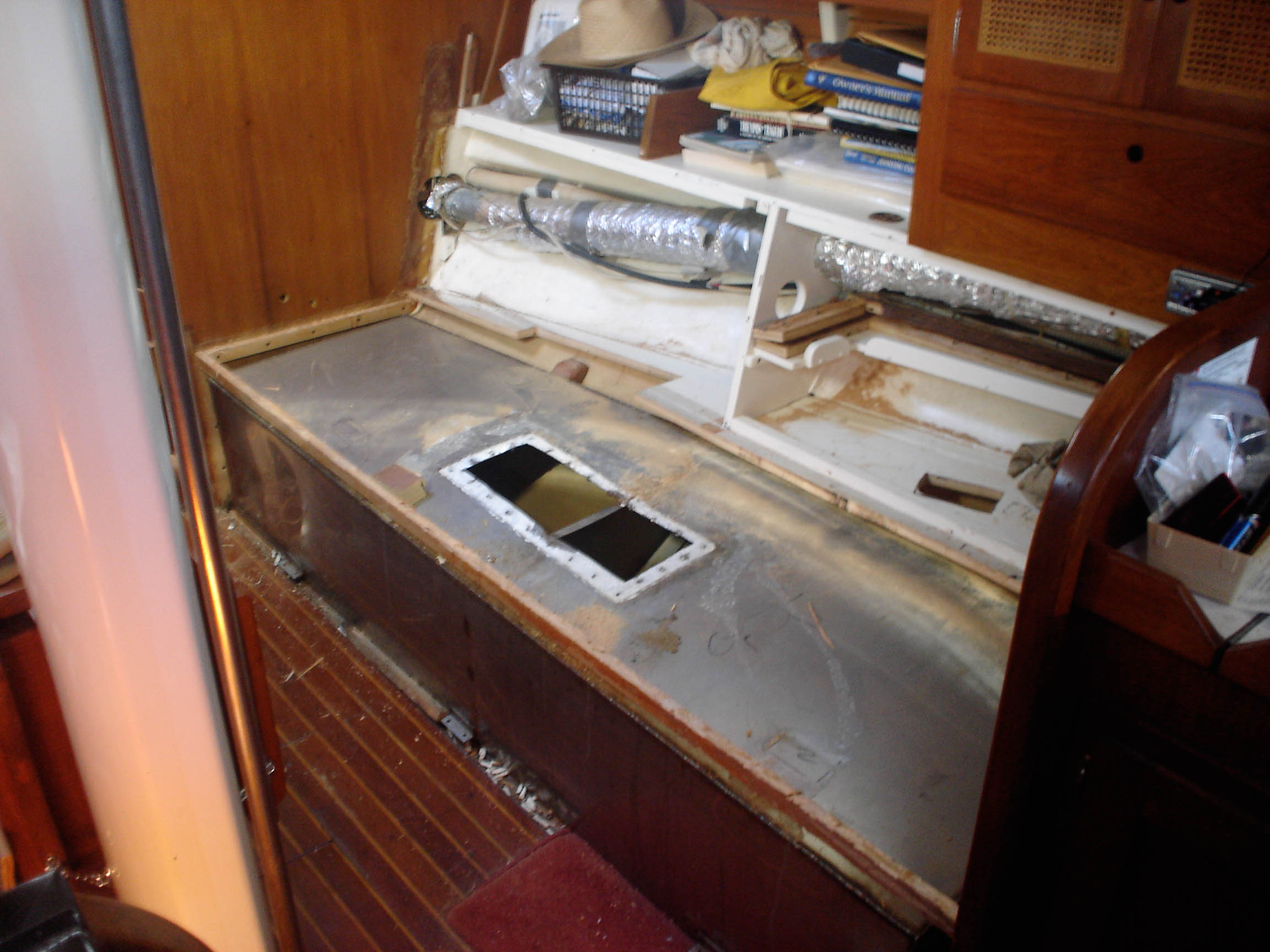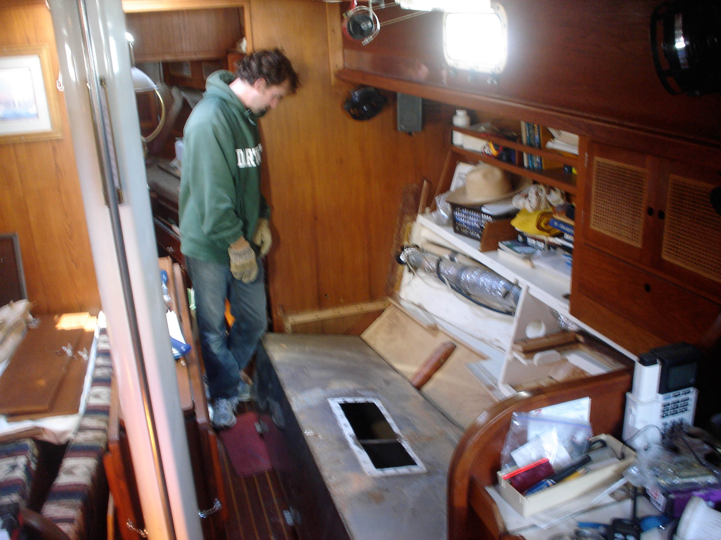 Actually, that’s only the first half of the mission. The old, leaky watertanks are out of the boat, and now we’ve gotta build new tanks, which we’re gonna make out of epoxy-coated marine-grade plywood. We’ve cut the pieces, but run out of time on this trip to continue…so it’ll have to wait.