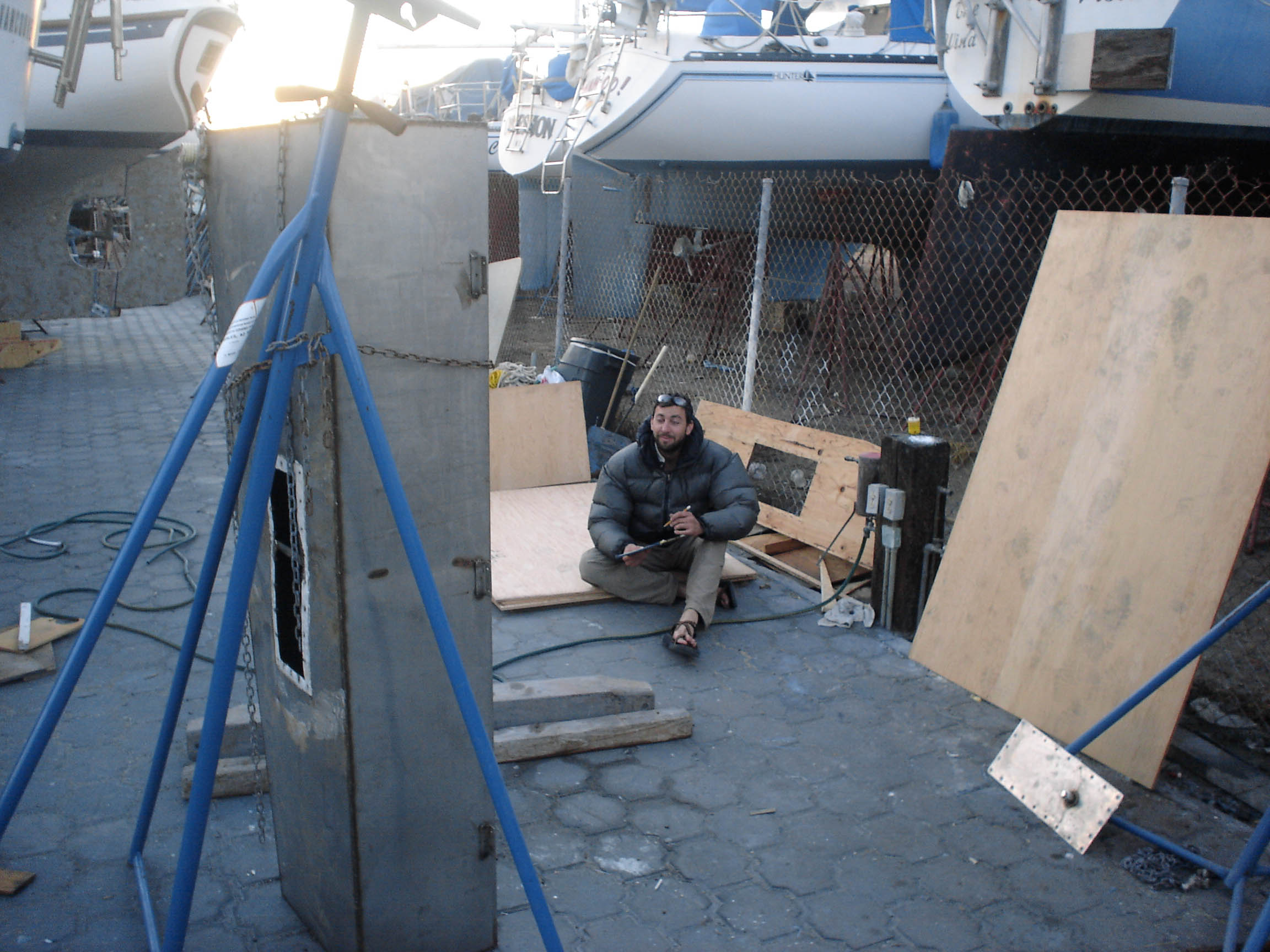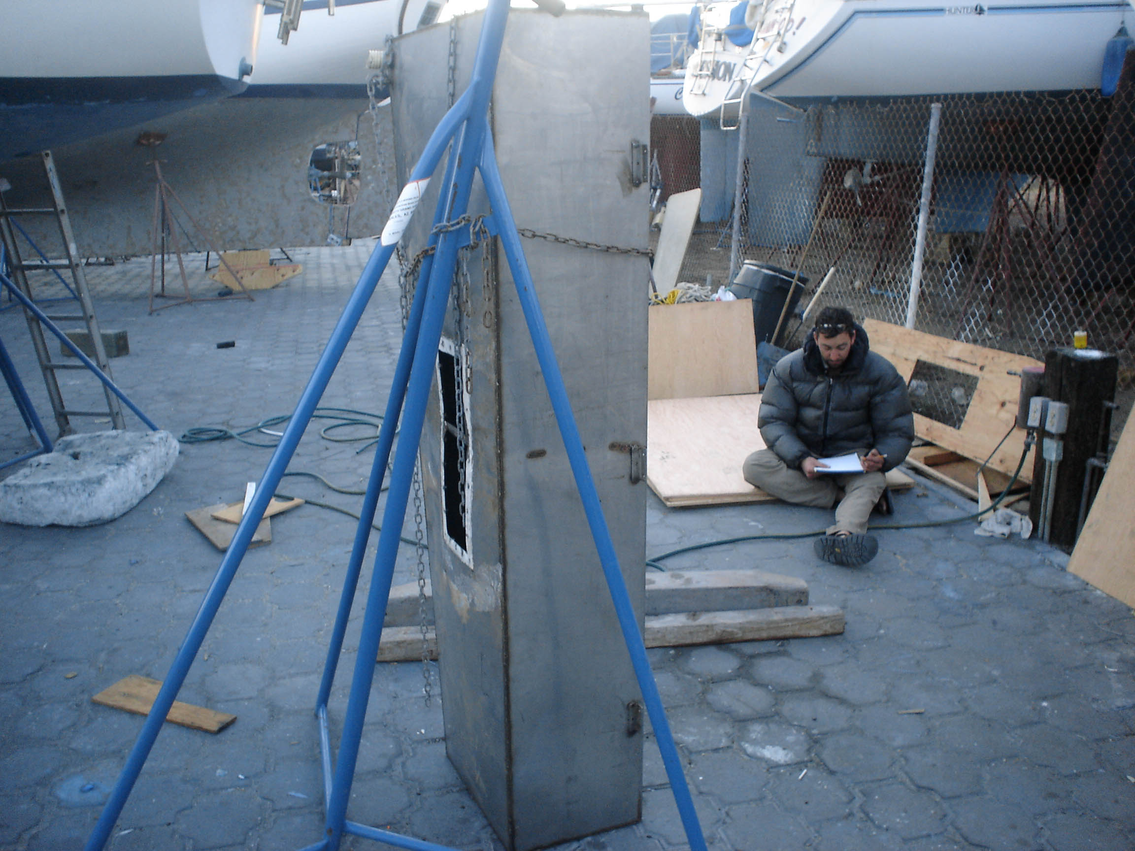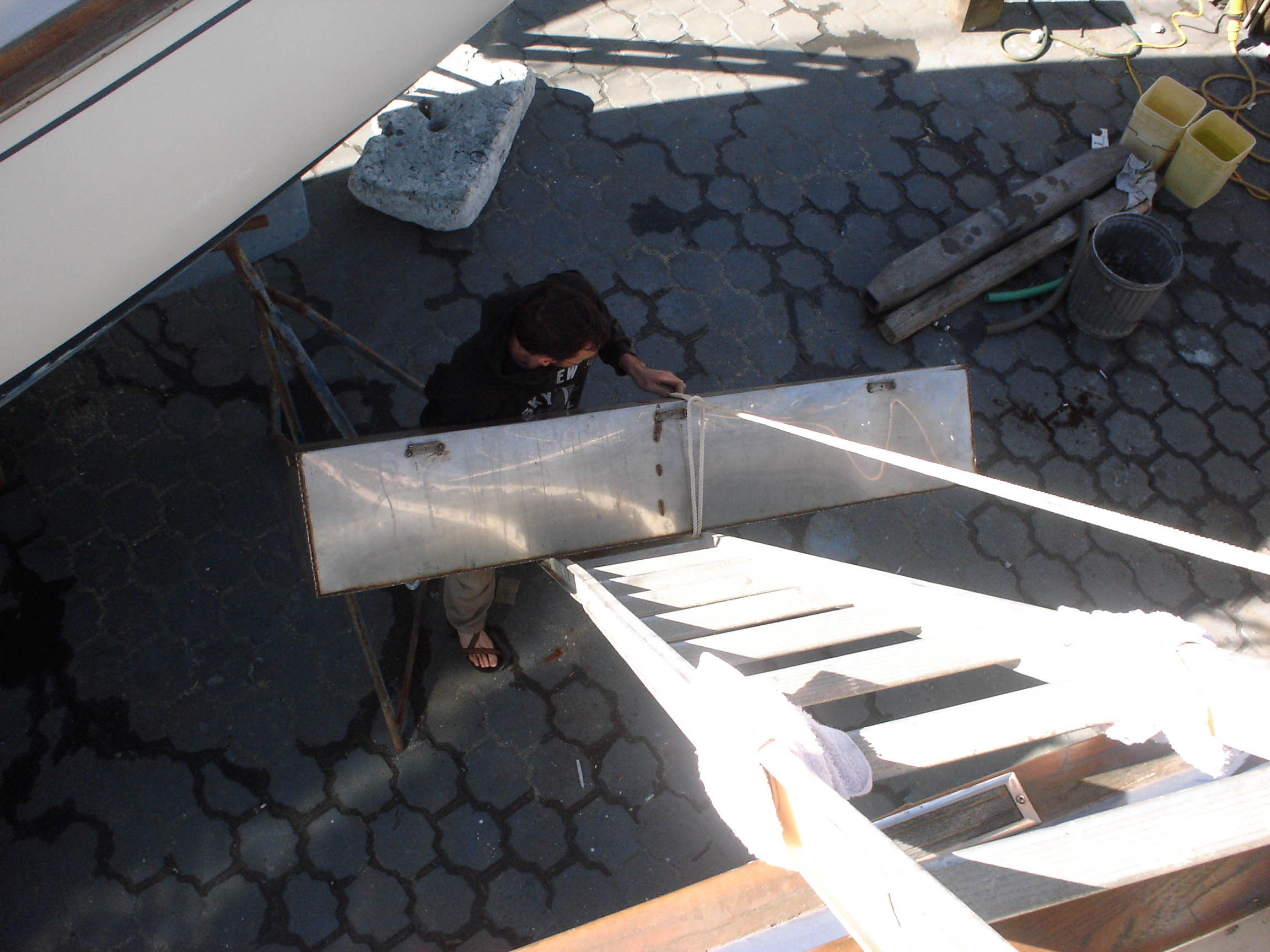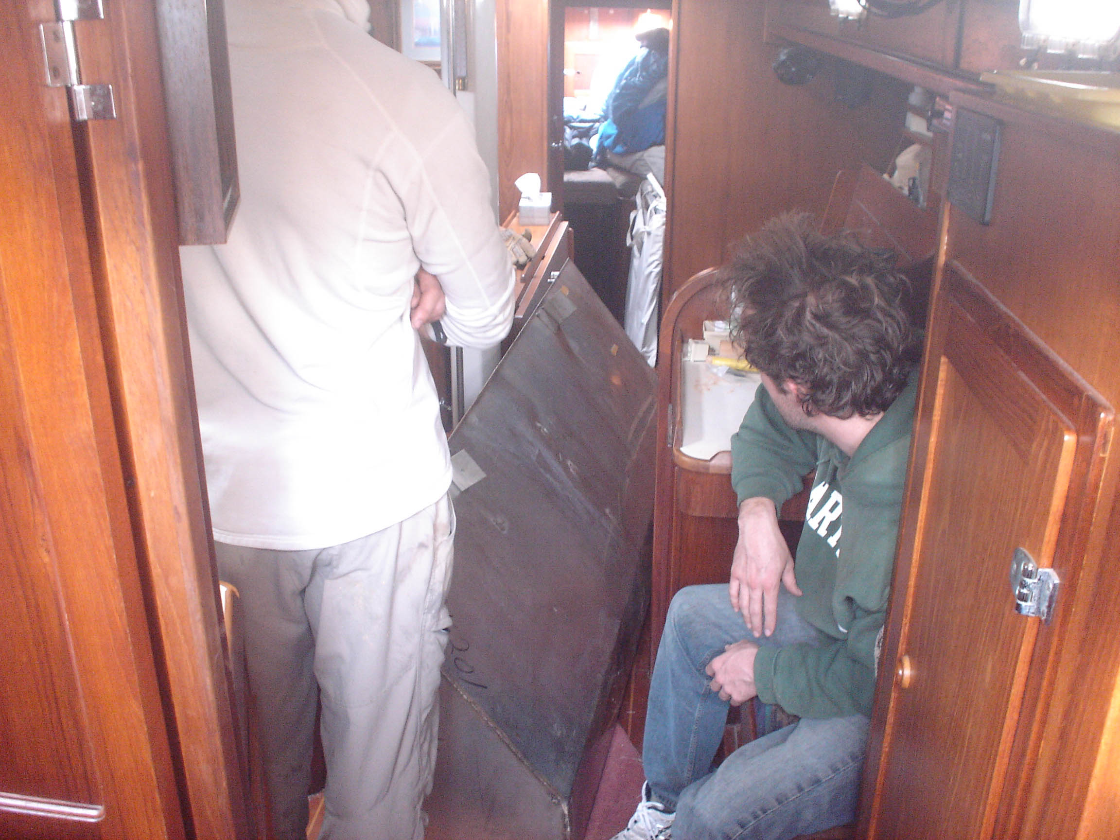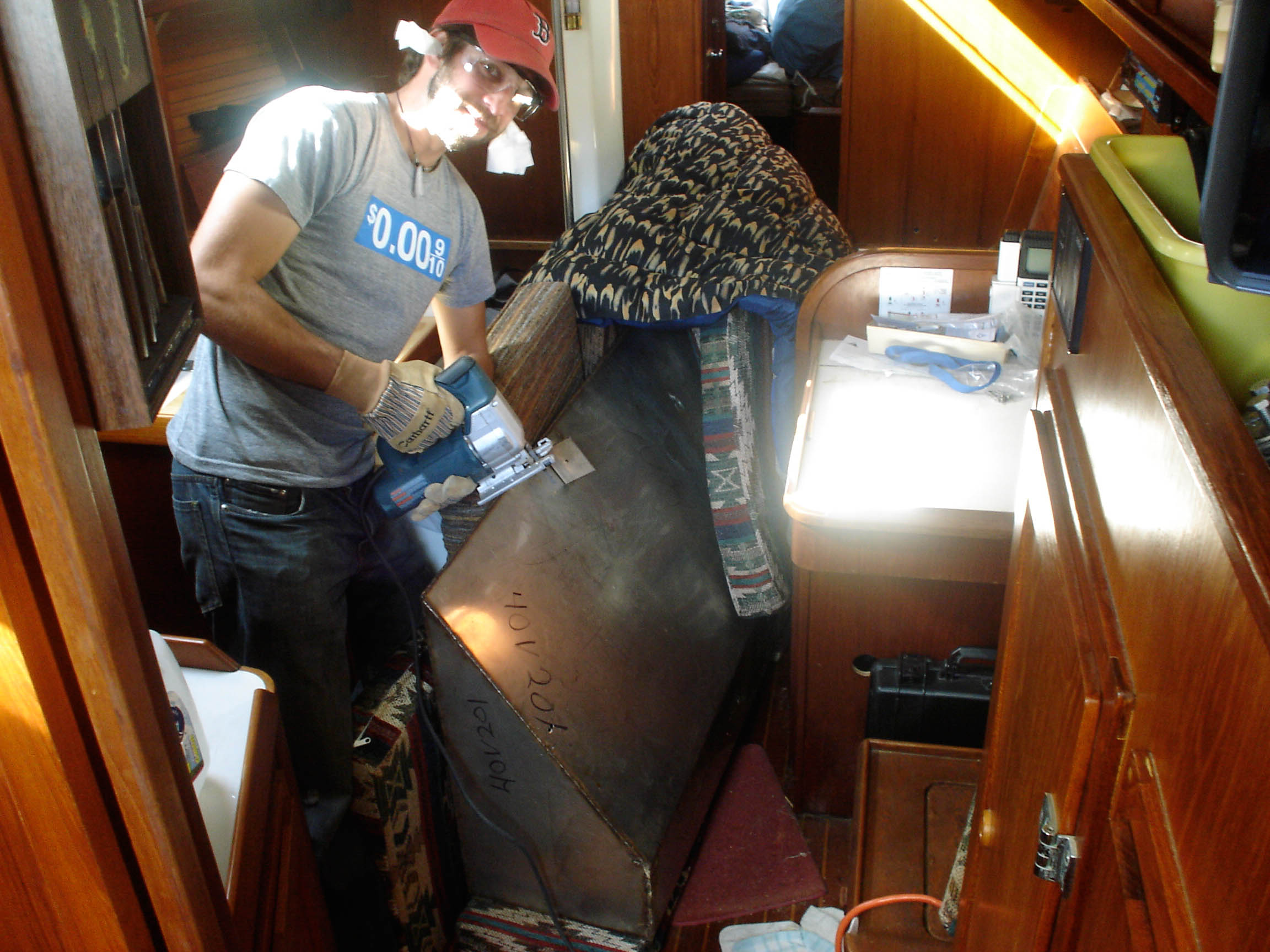 Q: Have we fixed our leaky water tanks? A: Not yet, but we’ve made good progress. We got the starboard watertank out of the boat, but the port watertank is a couple of inches bigger, and wouldn’t fit out the door. After finding the hand-saw worthless at cutting through 1/8″ stainless steel, and after having melted through six metal-cutting jig saw blades, and after having tried-but-finally-decided-against removing the companionway trim (to widen the door), we found a cutting disc for our grinder. After a brief test, we also decided to screw the marina rules and go for it. So late last night, we closed the hatches, padded the tank in pillows and cushions and blankets (to muffle the sound), and hacked away at the thing. Actually, Matt and Jon hacked away at the tank while I stealthily patrolled the dock, VHF radio in hand, so that we wouldn’t get busted. We used a code to disguise our operation: