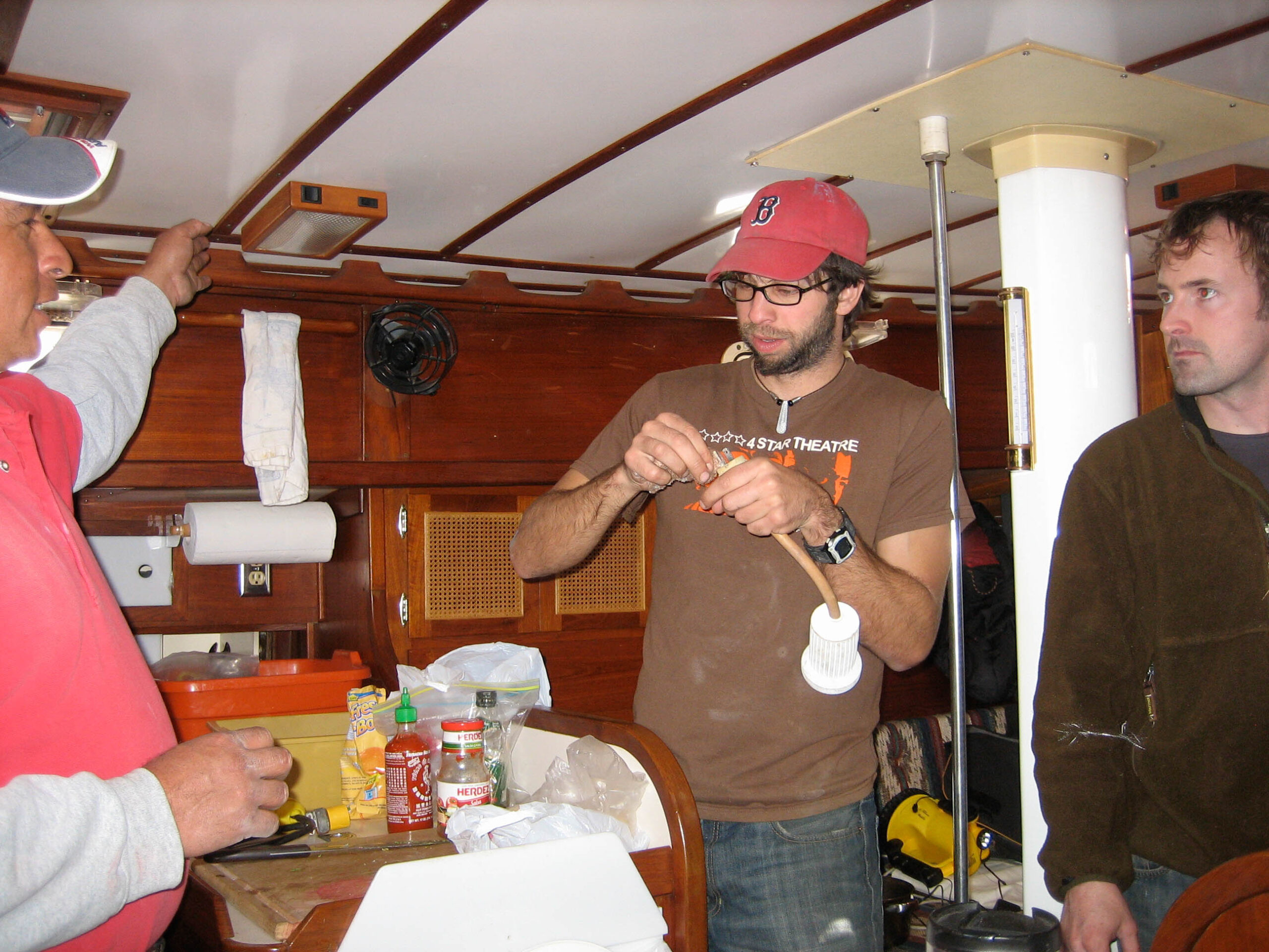 Once things were sufficiently fixed (albeit temporarily), we started measuring parts we planned on replacing. Jon and I hauled Matt up the mast (in a downpour) so that we could measure the standing rigging. After that, we got intimate with the boat’s plumbing (aka toilet), and figured out how we’re gonna rebuild it. We measured the lifelines, the diameters of the holes in the stanchions, deck fittings, and anything else we could approach with the caliper. We flipped through manuals, turned on electronics, crawled through lockers, and poked around the galley.