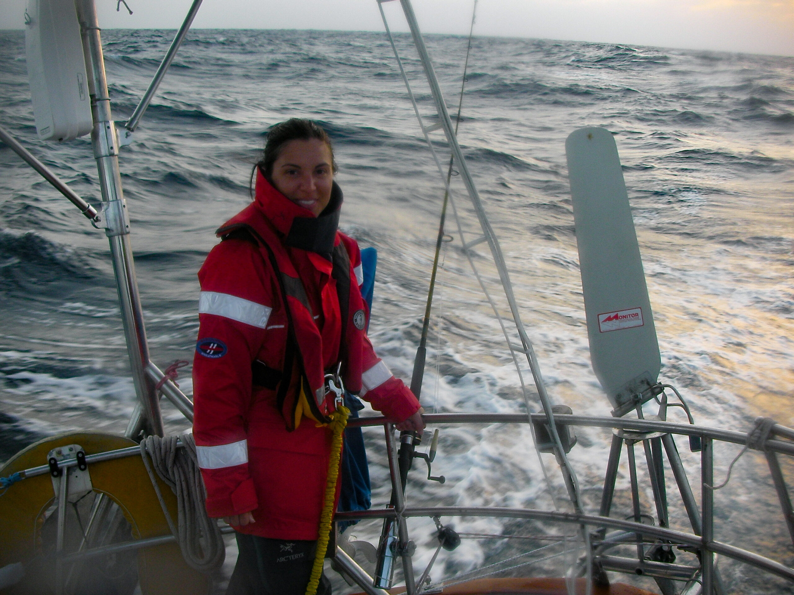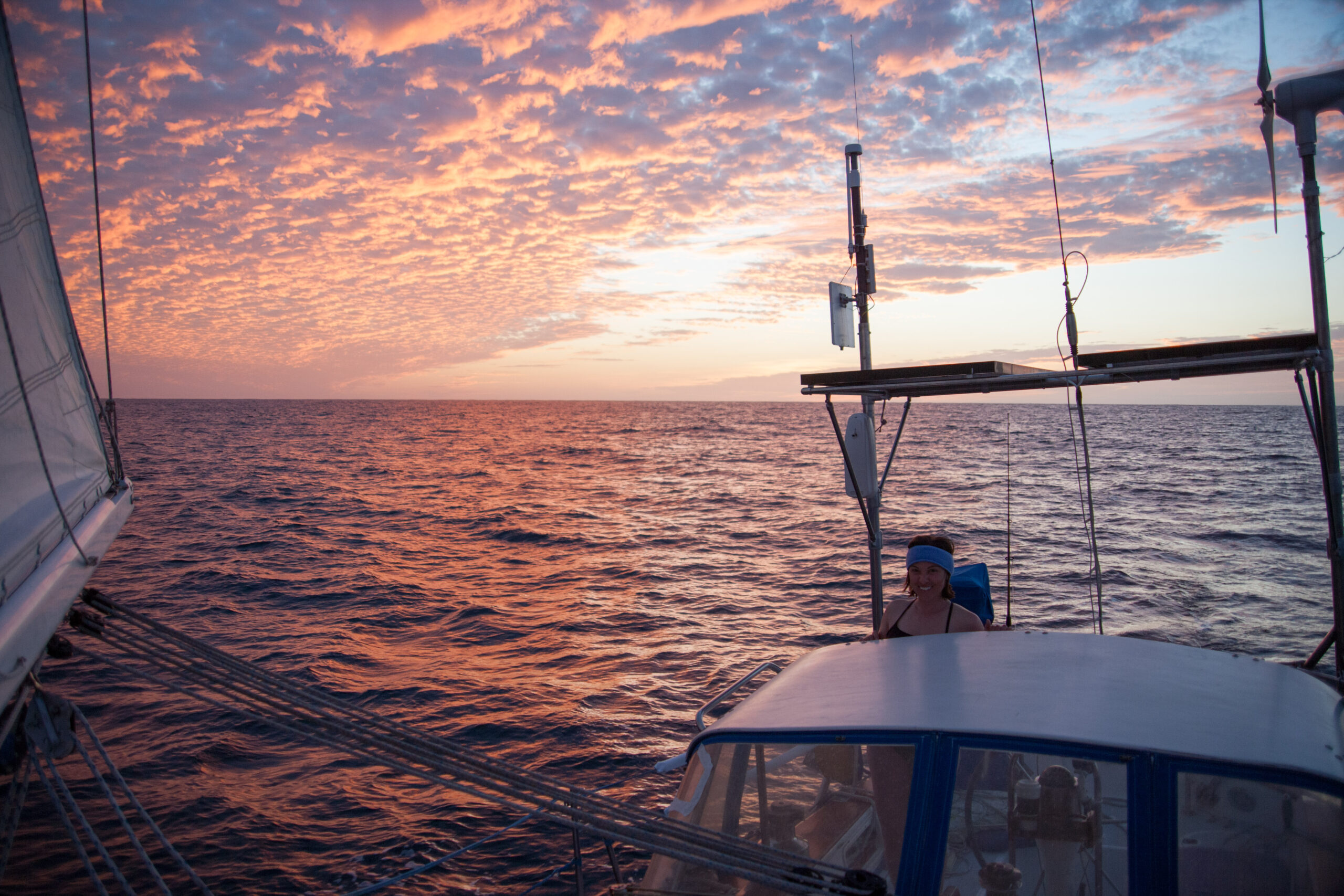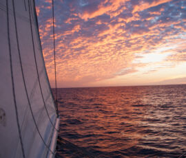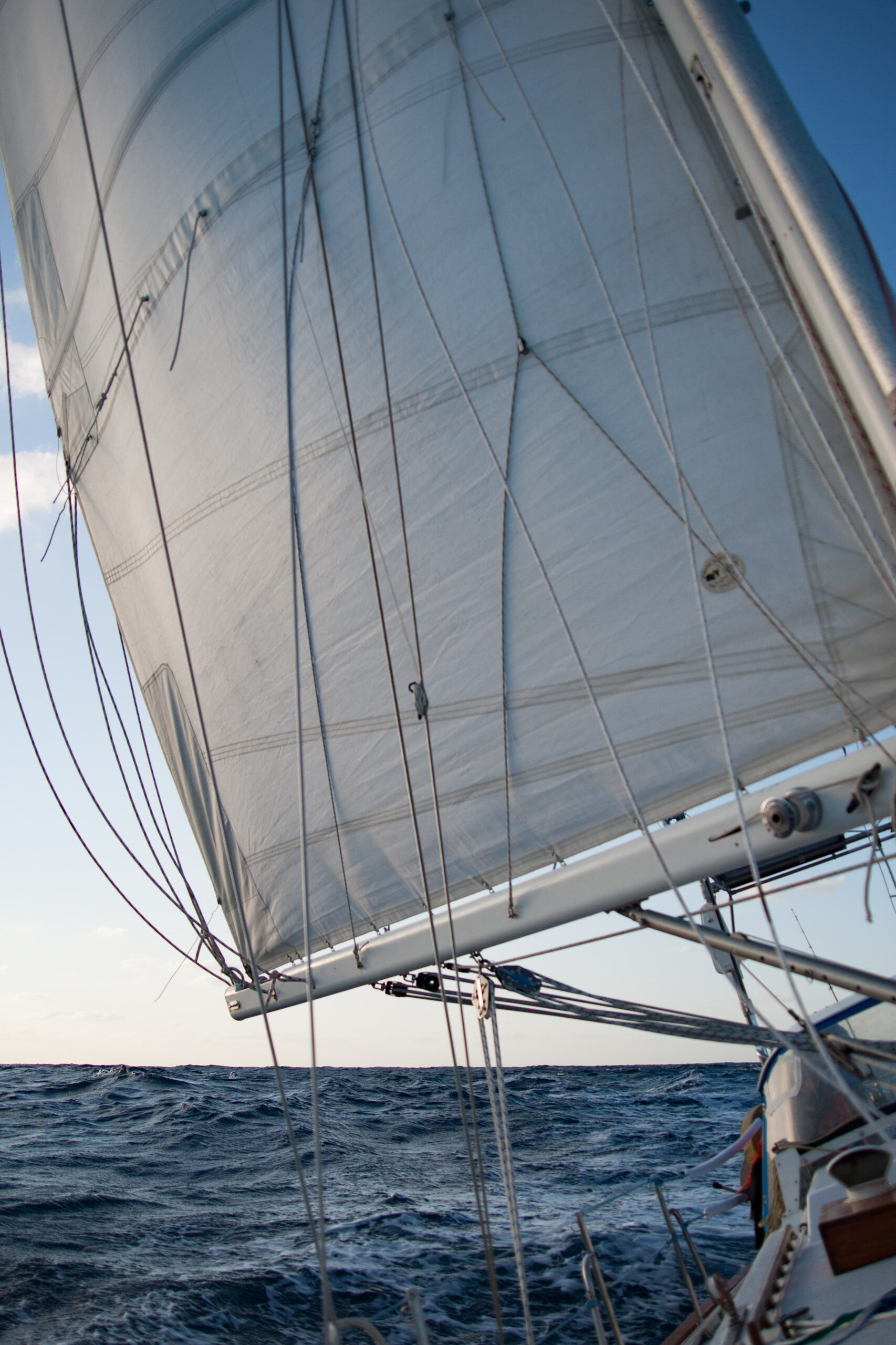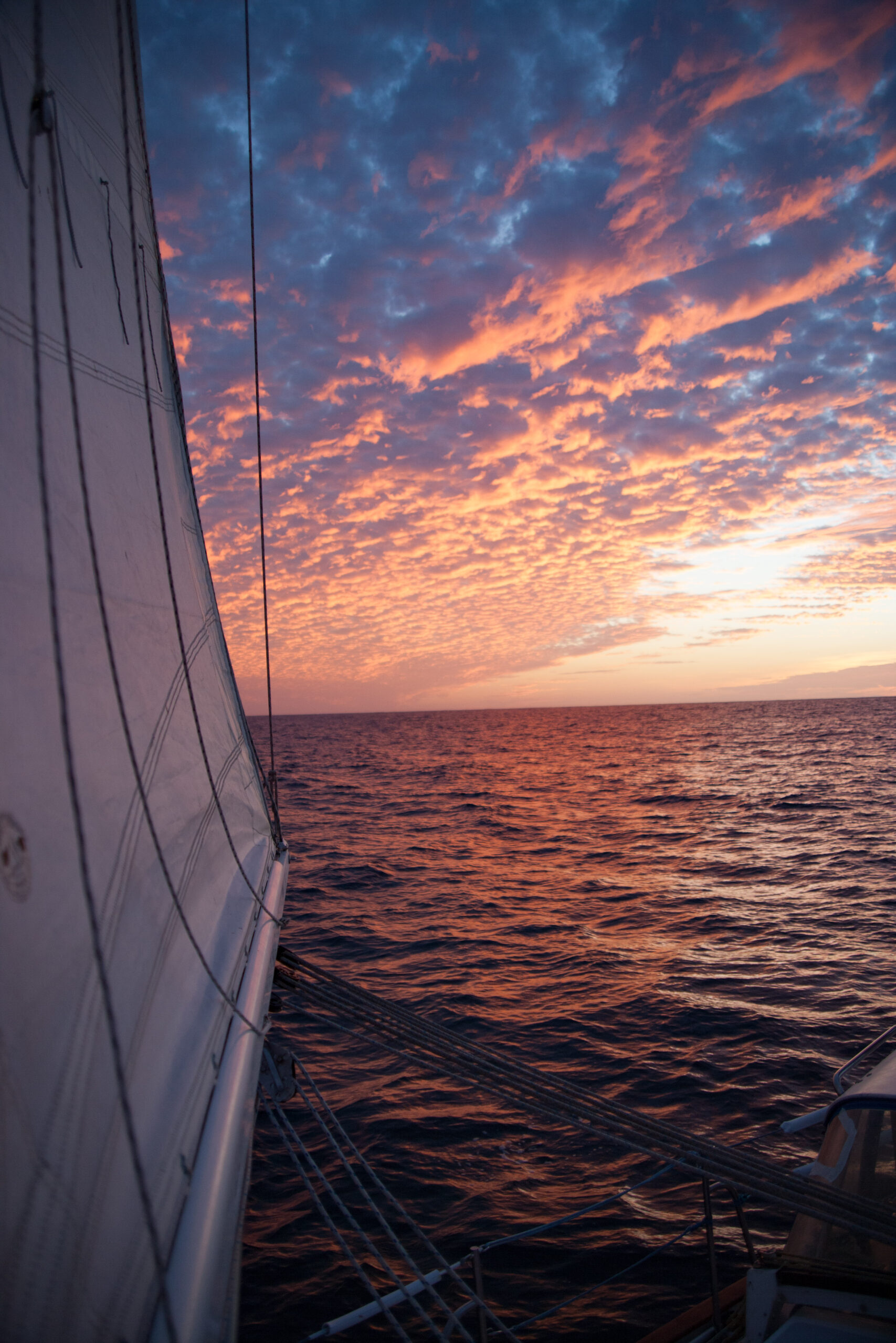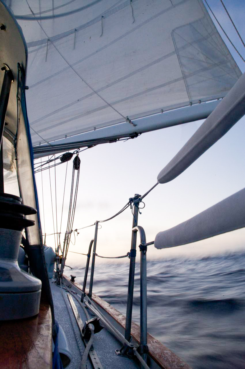 As it approached, the wind shifted around from behind us–where it is convenient for the wind to come from—to directly ahead of us–not so convenient (though expected). Still keen on making forward progress, however, we started beating into the wind. For the first five hours or so of windward sailing we were ecstatic to discover that it was our most comfortable point of sail so far: the wind waves had not yet built, so were were sailing smoothly into the wind with a following sea.