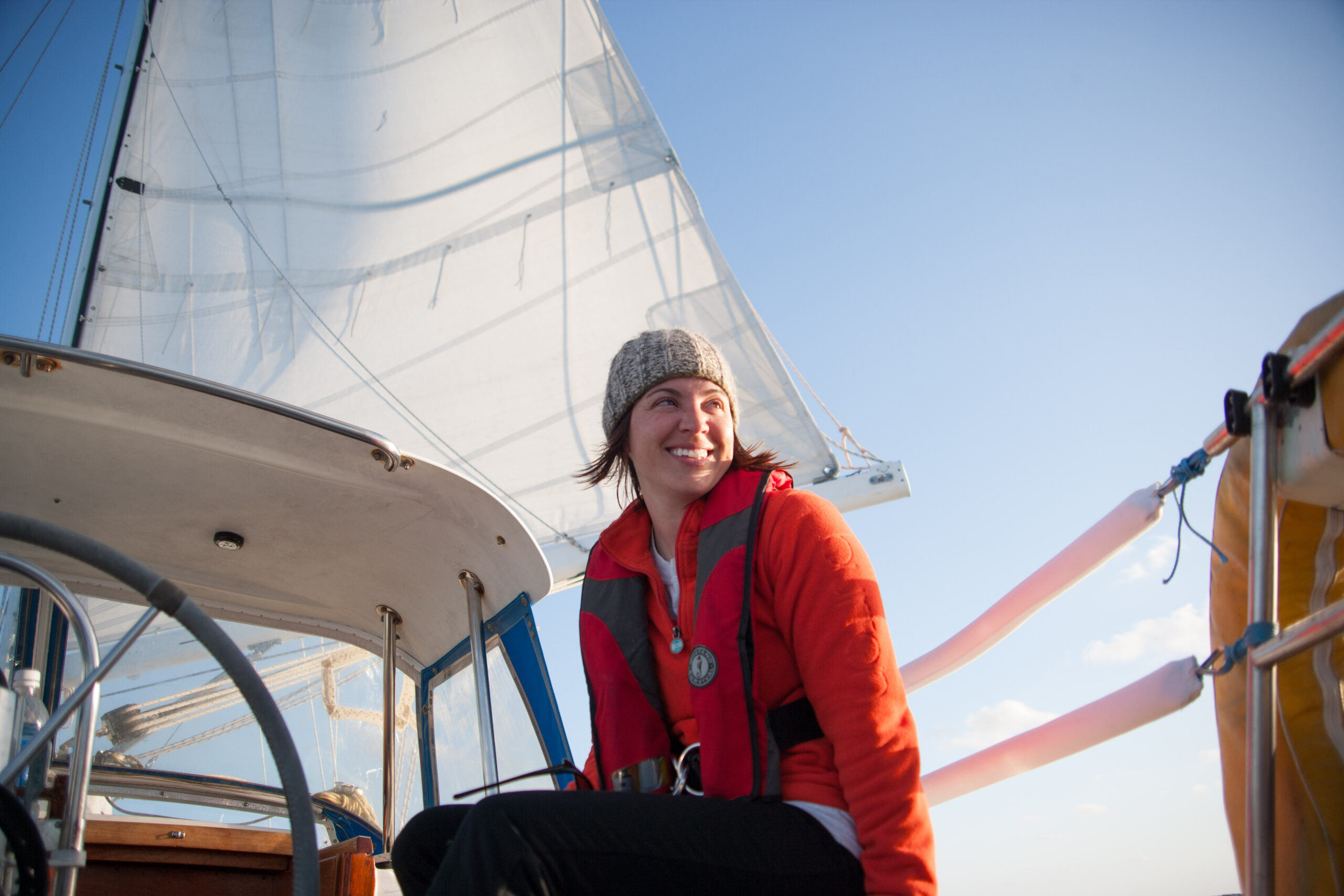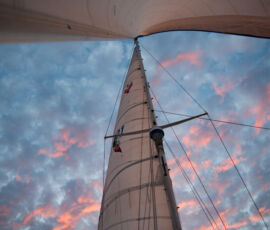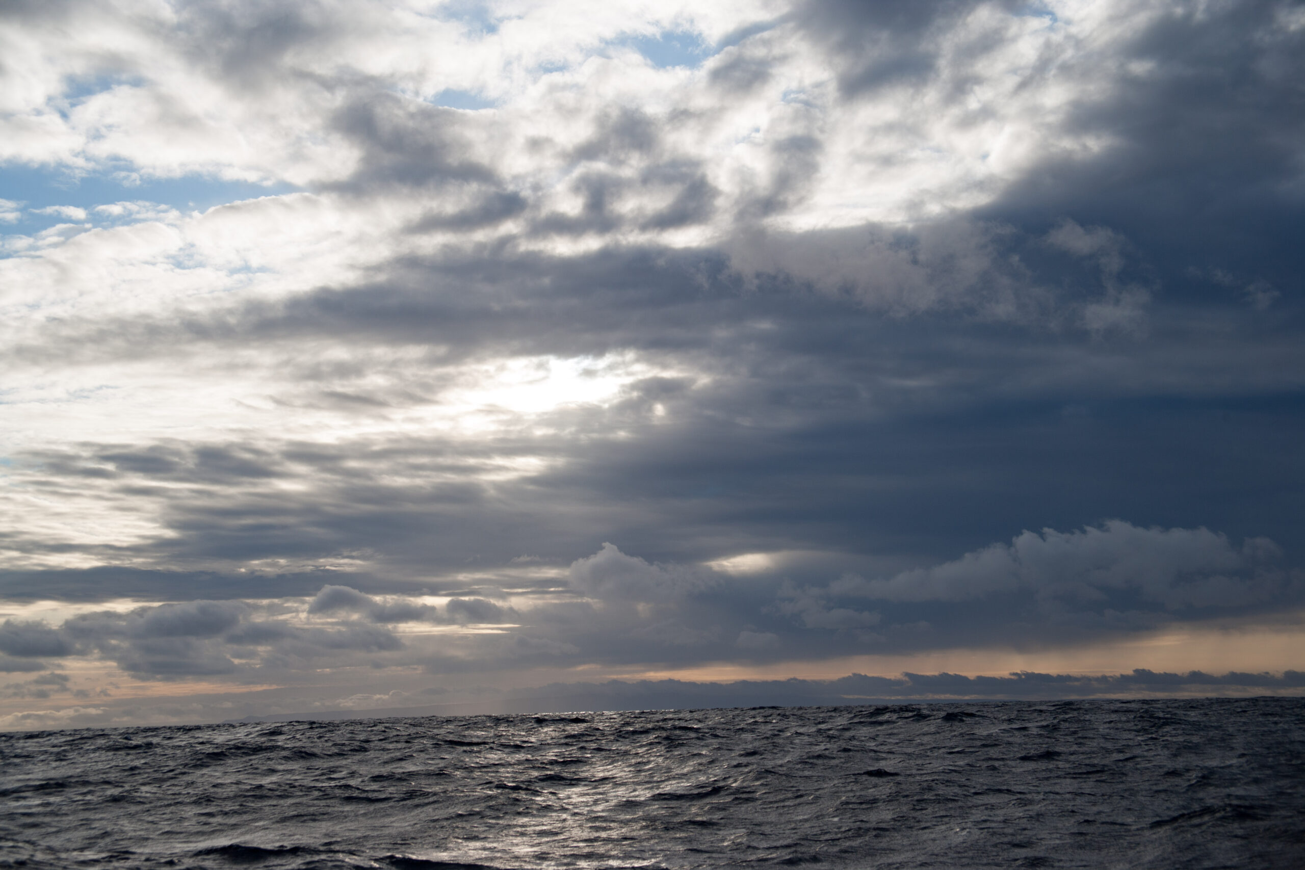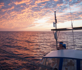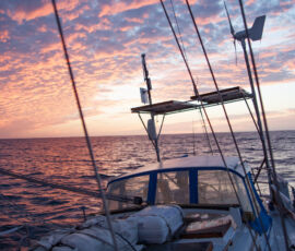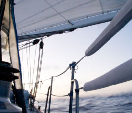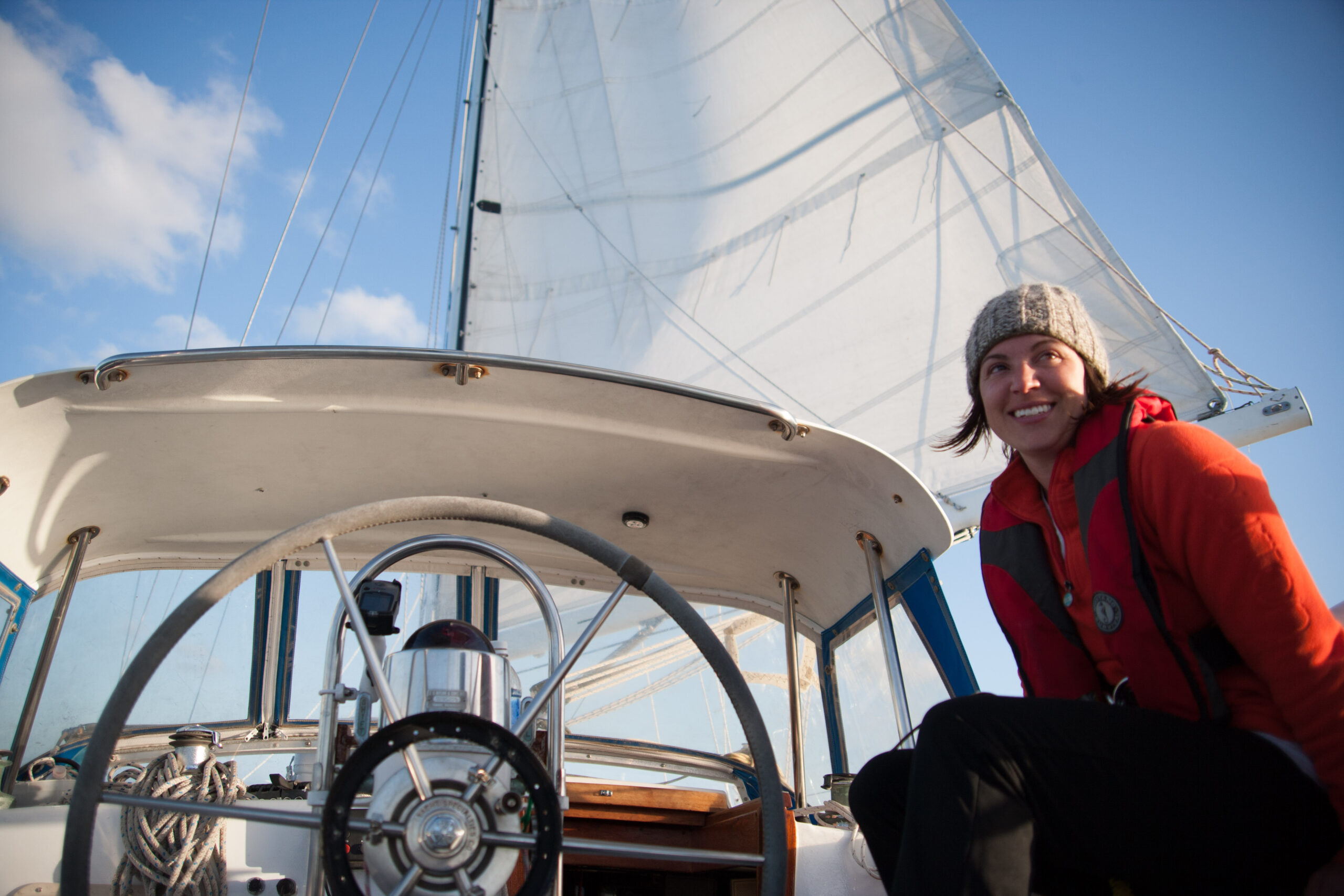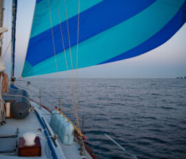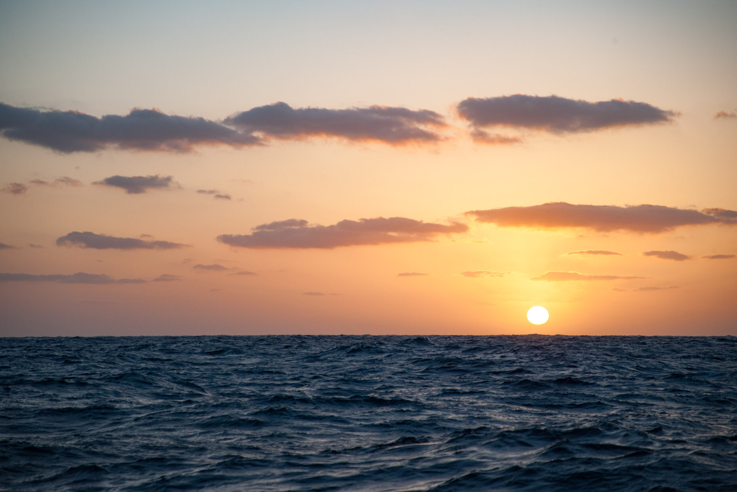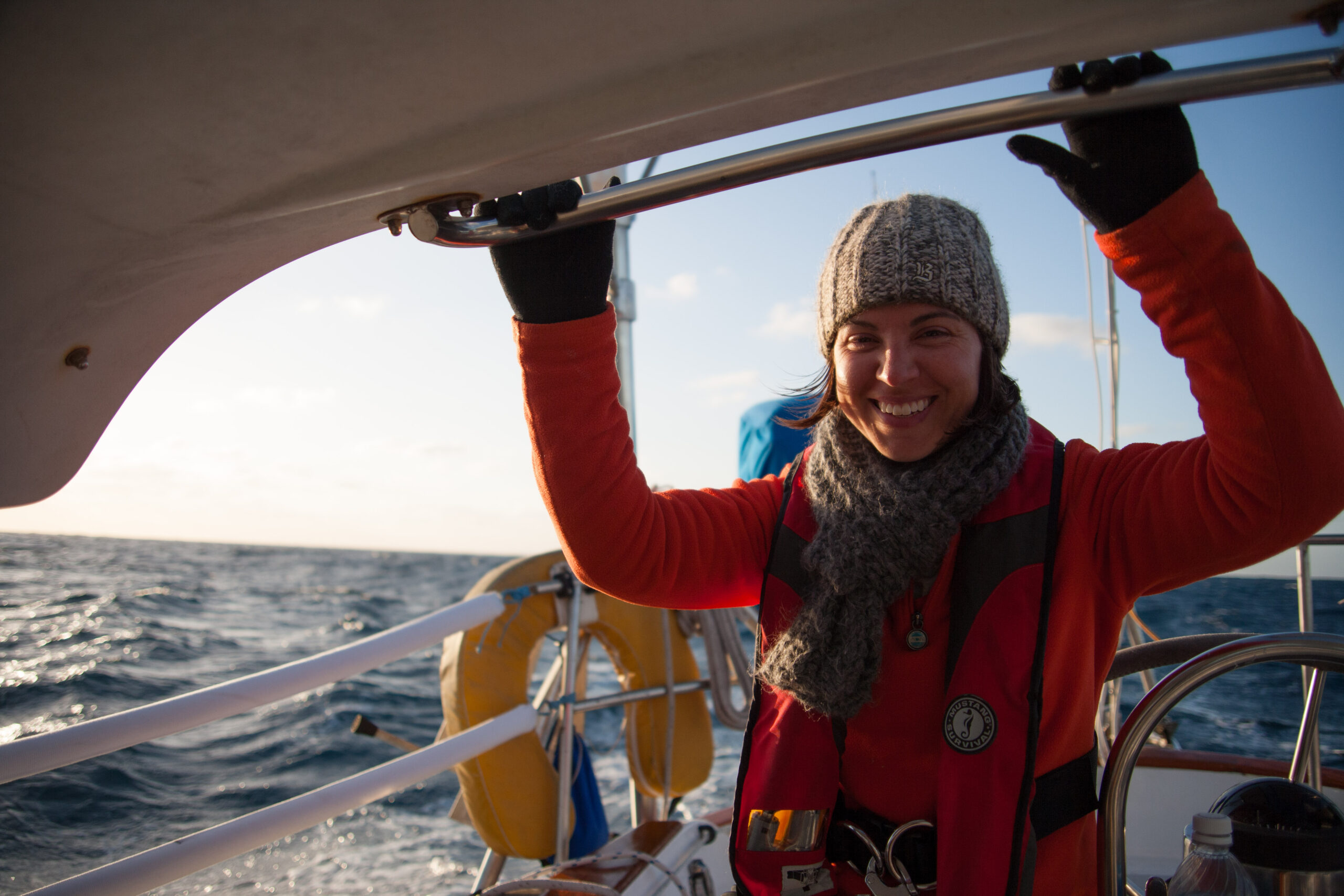 As it approached, the wind shifted around from behind us–where it is convenient for the wind to come from—to directly ahead of us–not so convenient (though expected). Still keen on making forward progress, however, we started beating into the wind. For the first five hours or so of windward sailing we were ecstatic to discover that it was our most comfortable point of sail so far: the wind waves had not yet built, so were were sailing smoothly into the wind with a following sea.